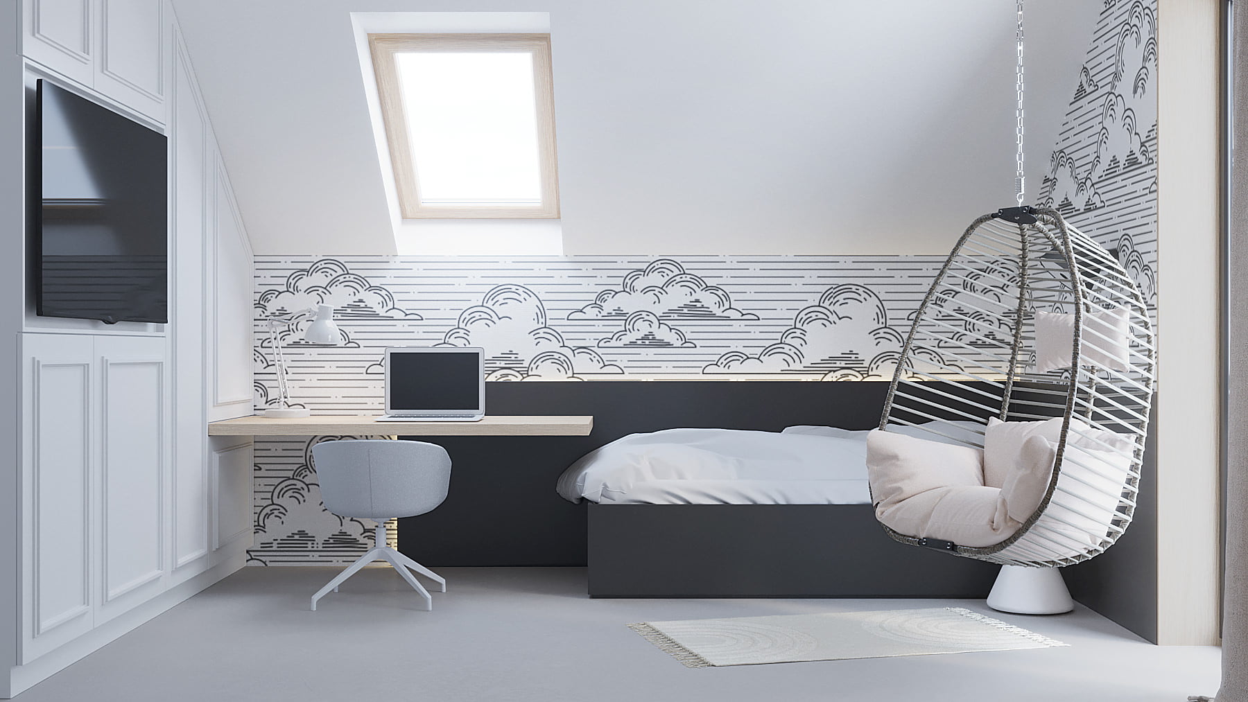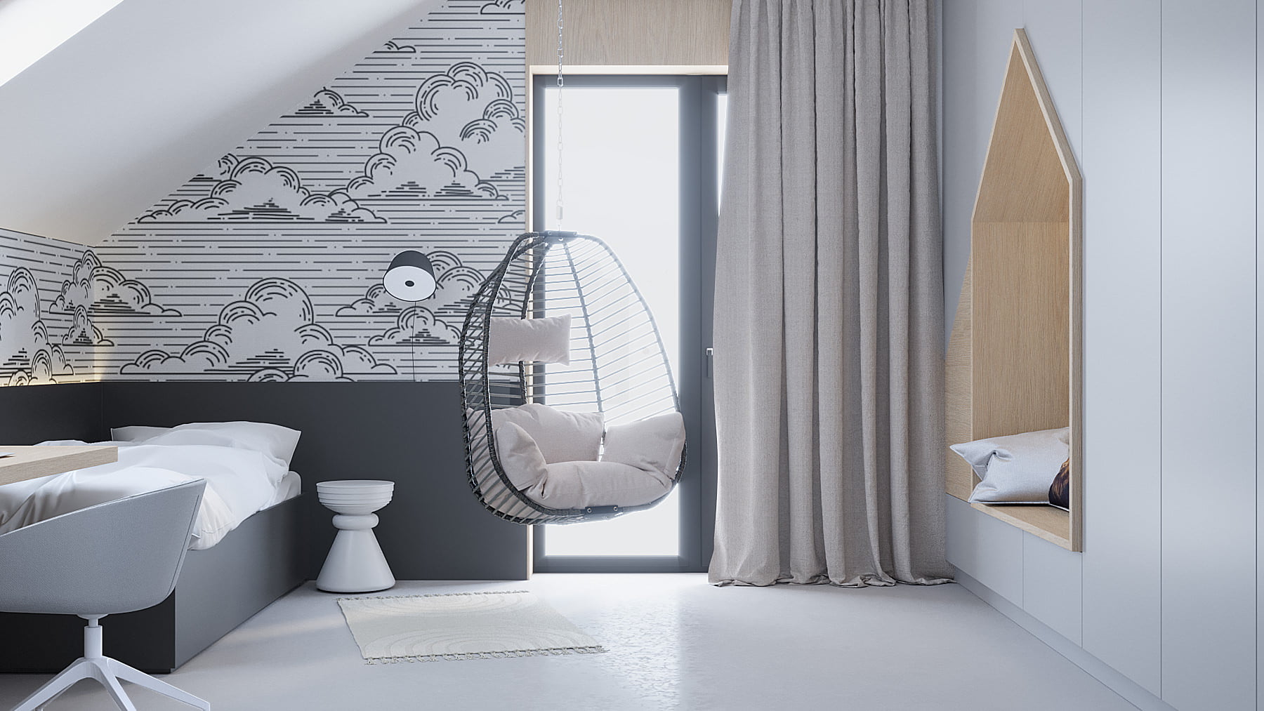 Piętro domu w Bibicach to dwa pokoje córek, łazienka oraz sypialnia z wydzieloną garderoba i prywatną łazienką. Minimalistyczna przestrzeń korytarza została podkreślona ciekawą grafiką. Pokój Blanki – motywem w tej przestrzeni miał być kolor czarny. Przy użyciu odpowiednich dodatków i faktur, udało się zaprojektować przestrzeń, w której można przyjemnie spędzić czas. Pokój Niny to całkowite przeciwieństwo pokoju siostry.
