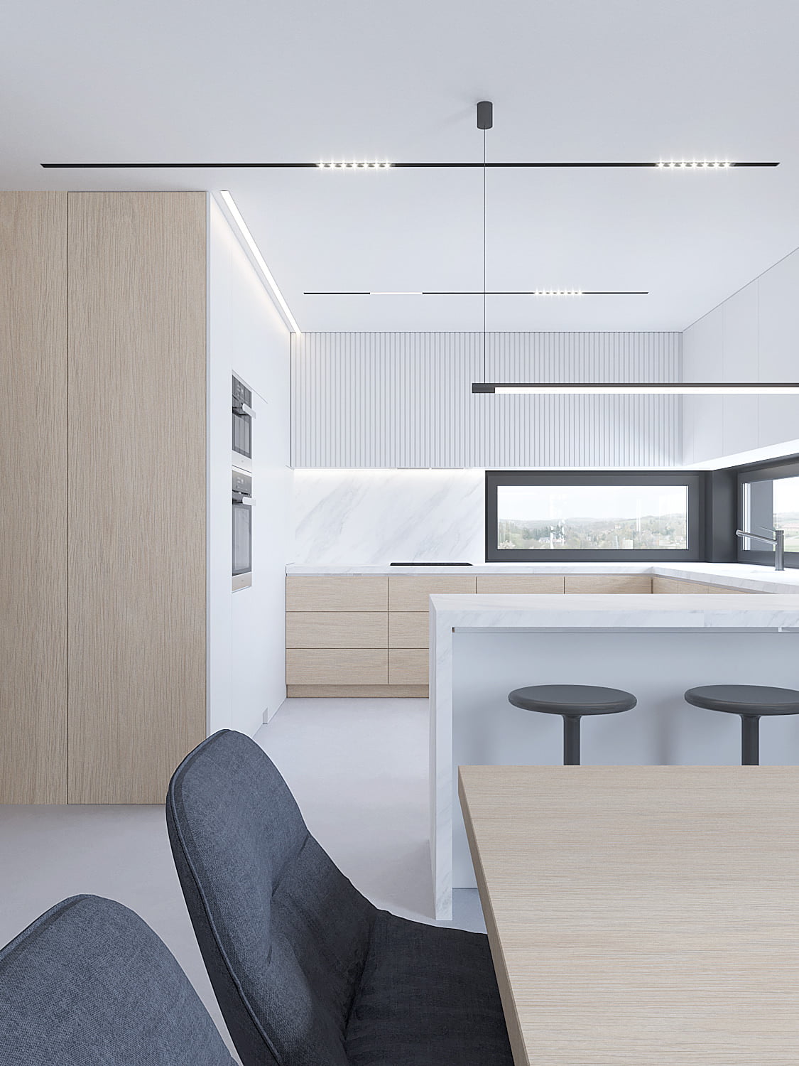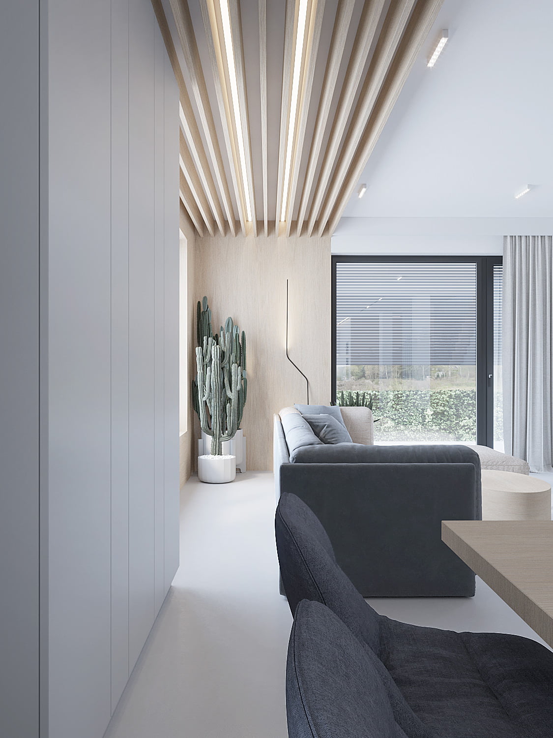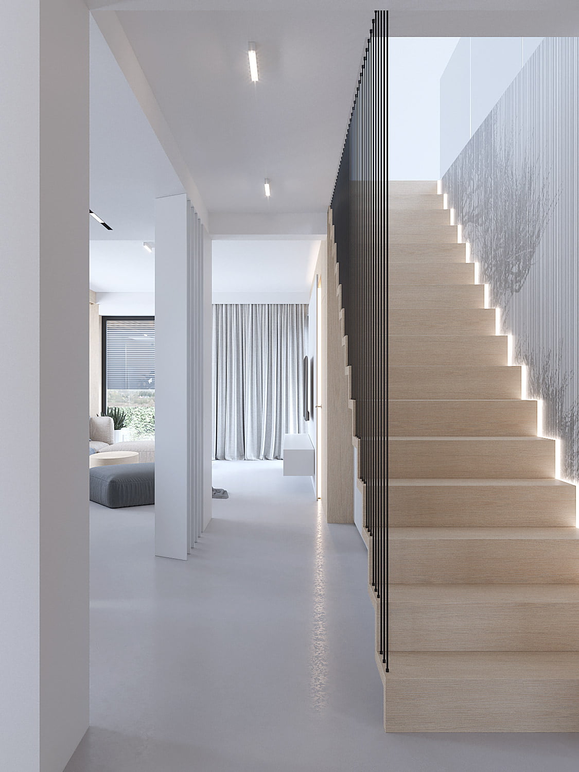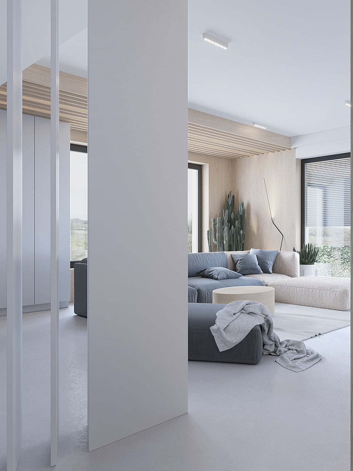 Dom jednorodzinny składający się z dwóch kondygnacji dla rodziny 2+2. Zastosowaliśmy w tym wnętrzu prostą, neutralną bazę. W całości posadzka została zaprojektowana do wykonania z szarej żywicy epoksydowej, dzięki czemu uzyskaliśmy jednolitą płaszczyznę tworzącą tło dla mebli. Biel na ścianach została przełamana płytami meblowymi z dekoracyjnymi frezami oraz jasnym drewnem. Nietypowa ażurowa przegroda, przysłanie tajemniczo obraz na salon i zaprasza do odkrycia co kryje się za nią.