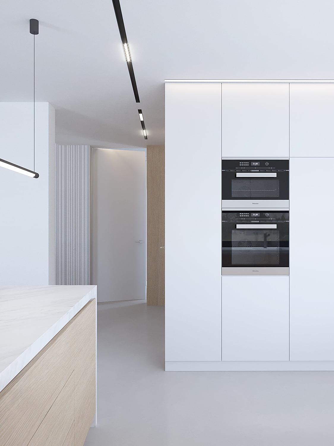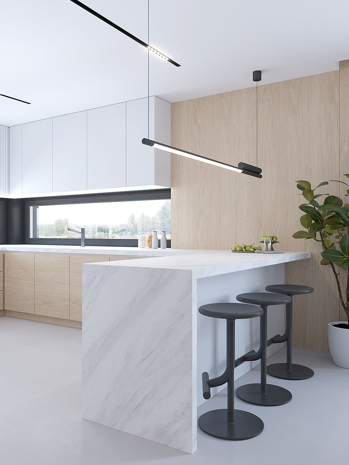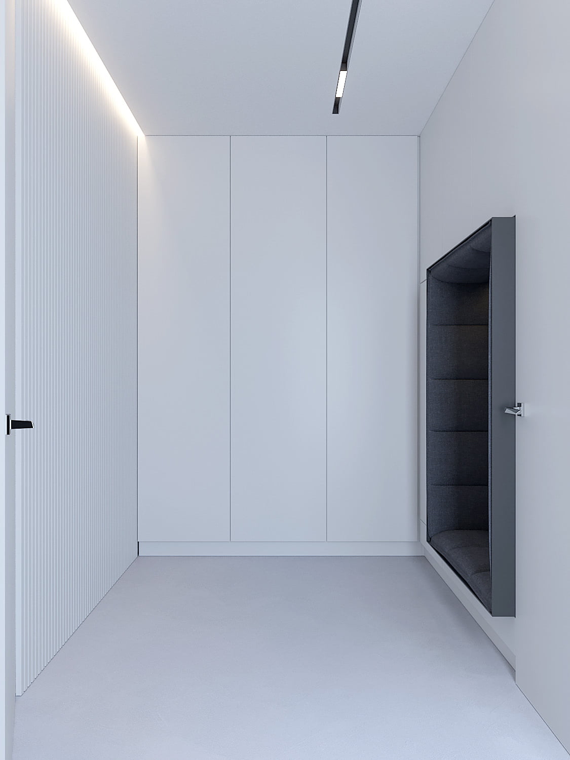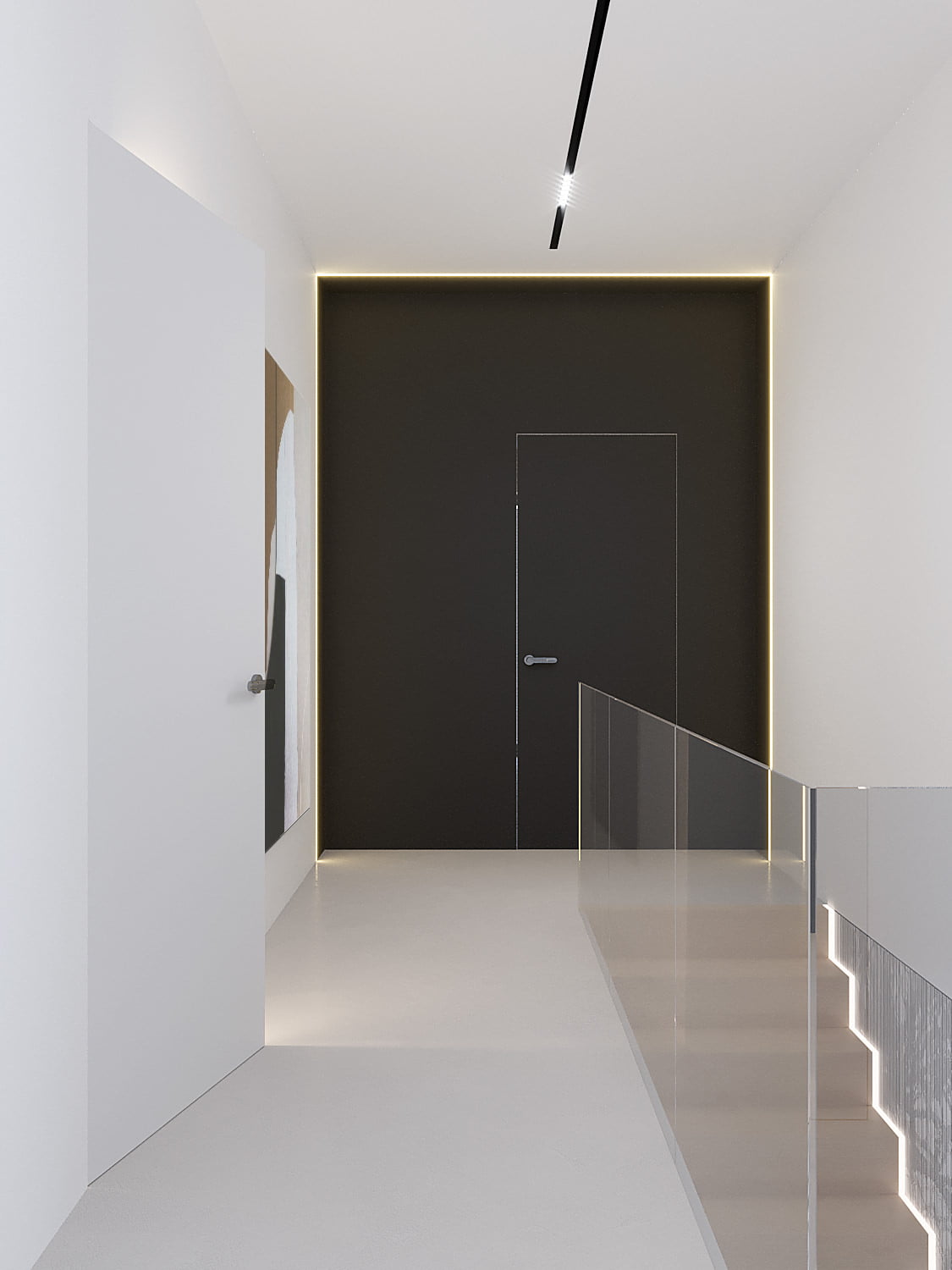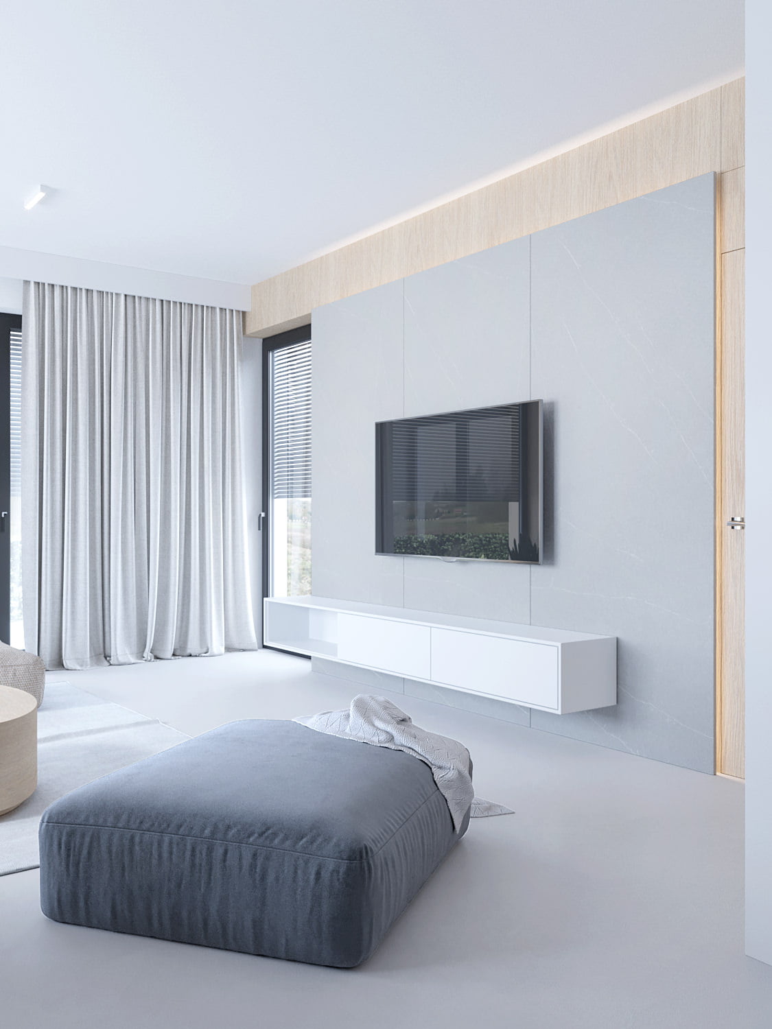 Dom jednorodzinny składający się z dwóch kondygnacji dla rodziny 2+2. Zastosowaliśmy w tym wnętrzu prostą, neutralną bazę. W całości posadzka została zaprojektowana do wykonania z szarej żywicy epoksydowej, dzięki czemu uzyskaliśmy jednolitą płaszczyznę tworzącą tło dla mebli. Biel na ścianach została przełamana płytami meblowymi z dekoracyjnymi frezami oraz jasnym drewnem. Nietypowa ażurowa przegroda, przysłanie tajemniczo obraz na salon i zaprasza do odkrycia co kryje się za nią.