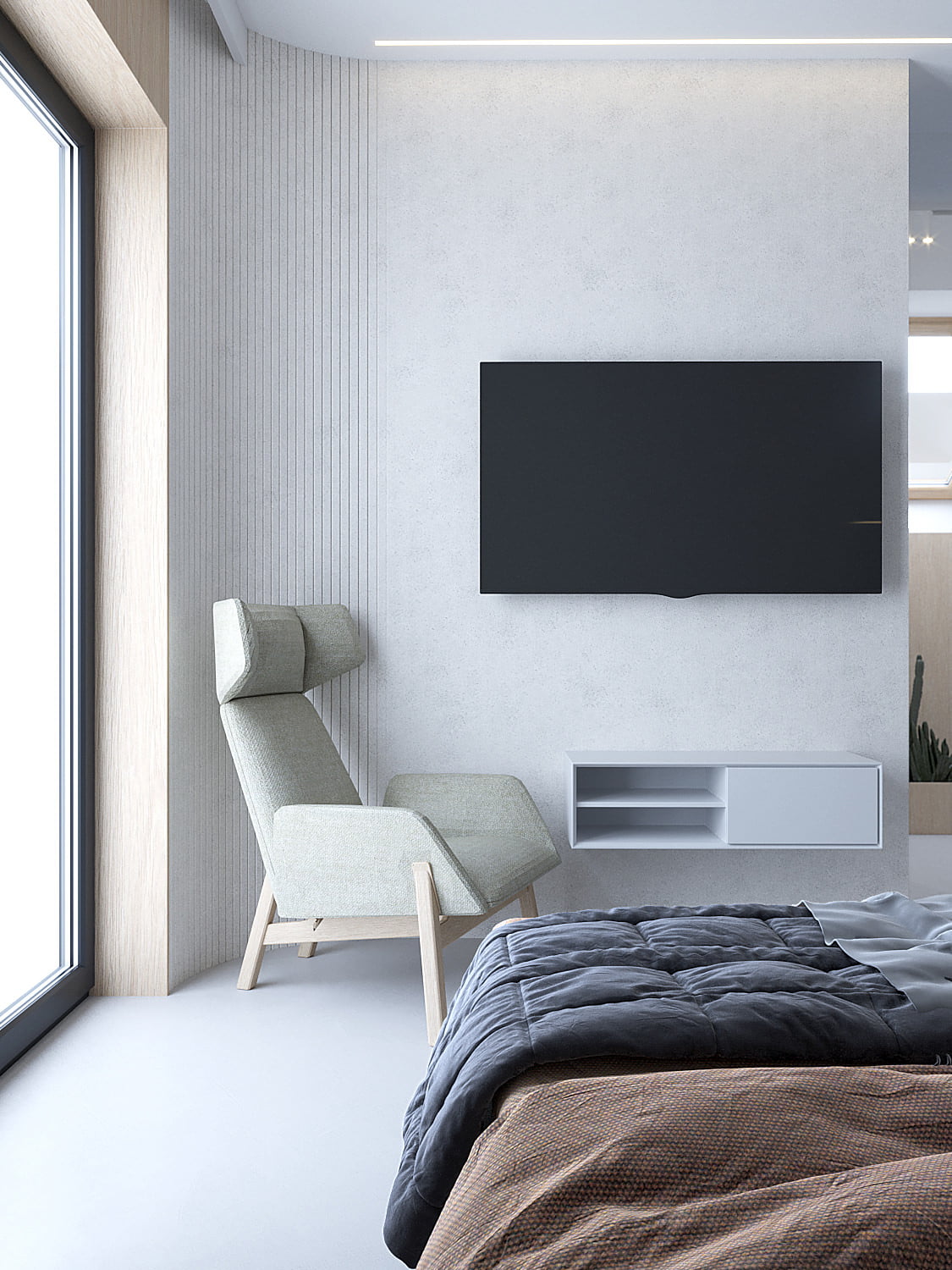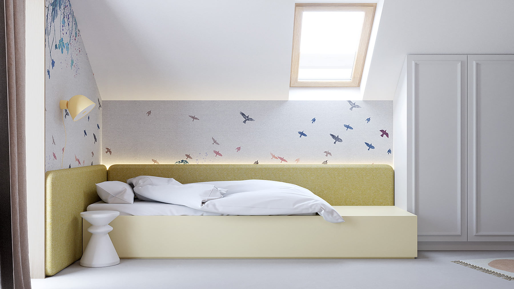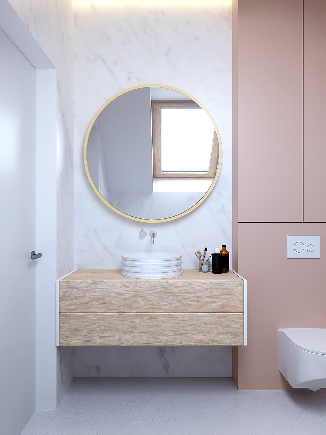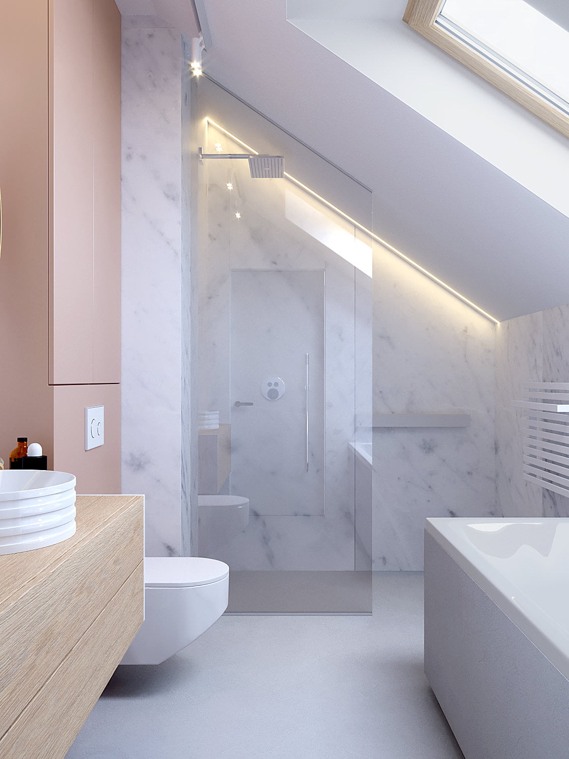 Pastelowe barwy, przeplatane z jasnym drewnem w postaci lameli dekoracyjnych, ocieplają całą przestrzeń, nadając klimatu. Sypialnia Inwestorów utrzymana jest w chłodnych barwach, jednak wzory znajdujące się na jednej ze ścian nadają niepowtarzalnego wyrazu całej przestrzeni. Łazienka prywatna, dzięki jasnym barwom oraz oknie w centralnym miejscu, wydaje się dużo bardziej przestrzenna.