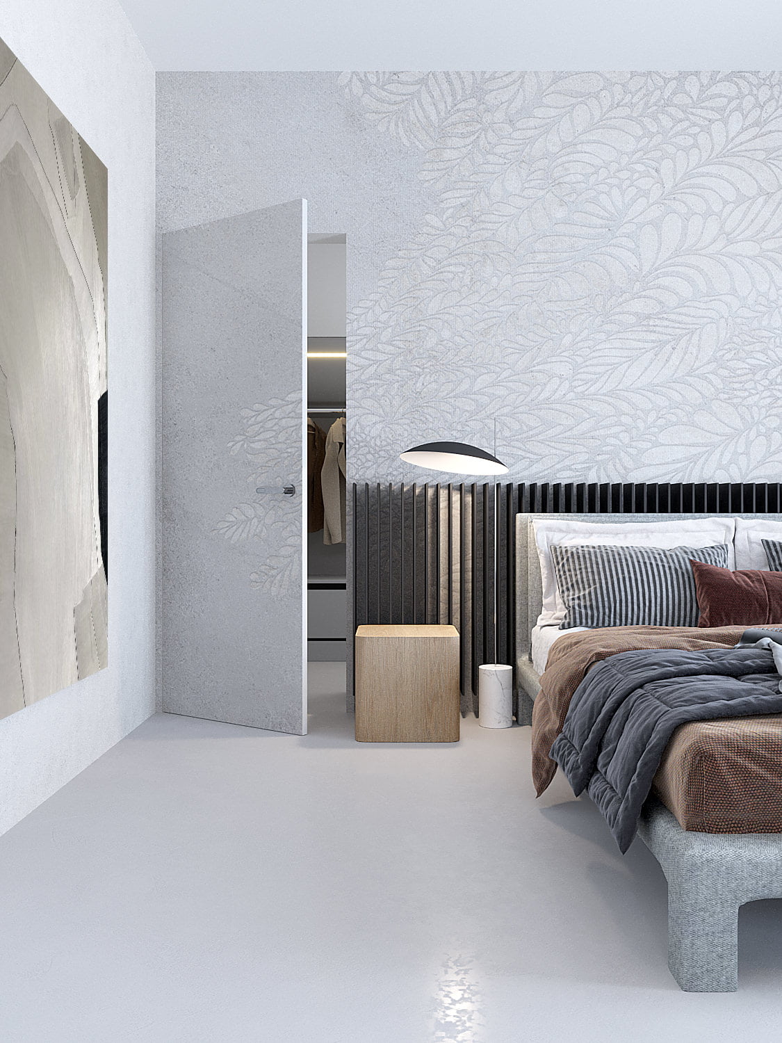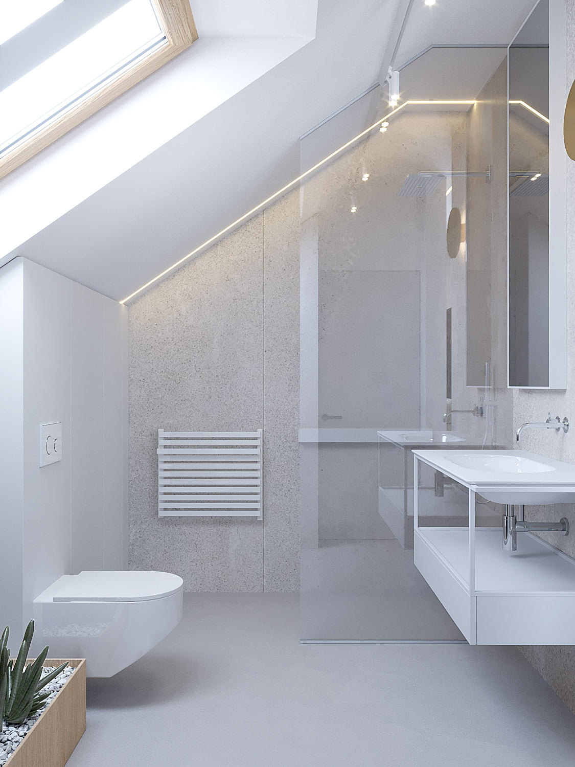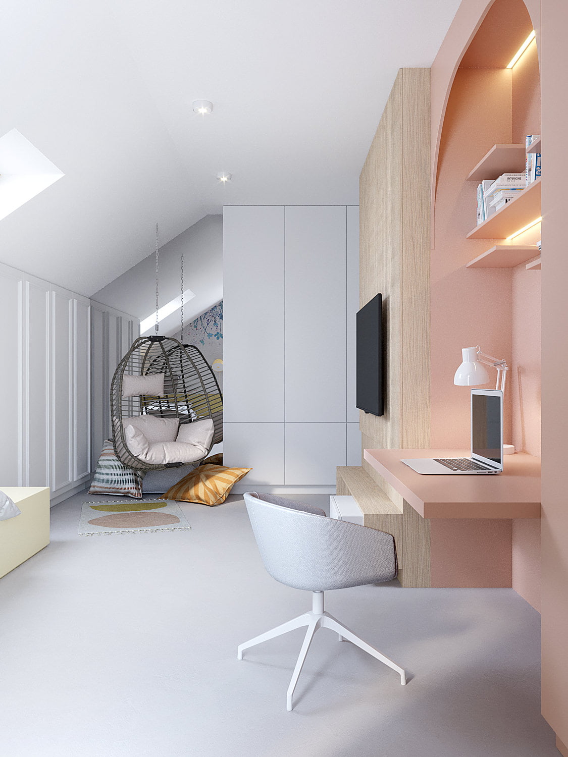 Pastelowe barwy, przeplatane z jasnym drewnem w postaci lameli dekoracyjnych, ocieplają całą przestrzeń, nadając klimatu. Sypialnia Inwestorów utrzymana jest w chłodnych barwach, jednak wzory znajdujące się na jednej ze ścian nadają niepowtarzalnego wyrazu całej przestrzeni. Łazienka prywatna, dzięki jasnym barwom oraz oknie w centralnym miejscu, wydaje się dużo bardziej przestrzenna.