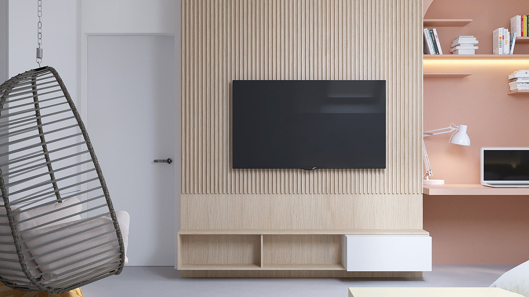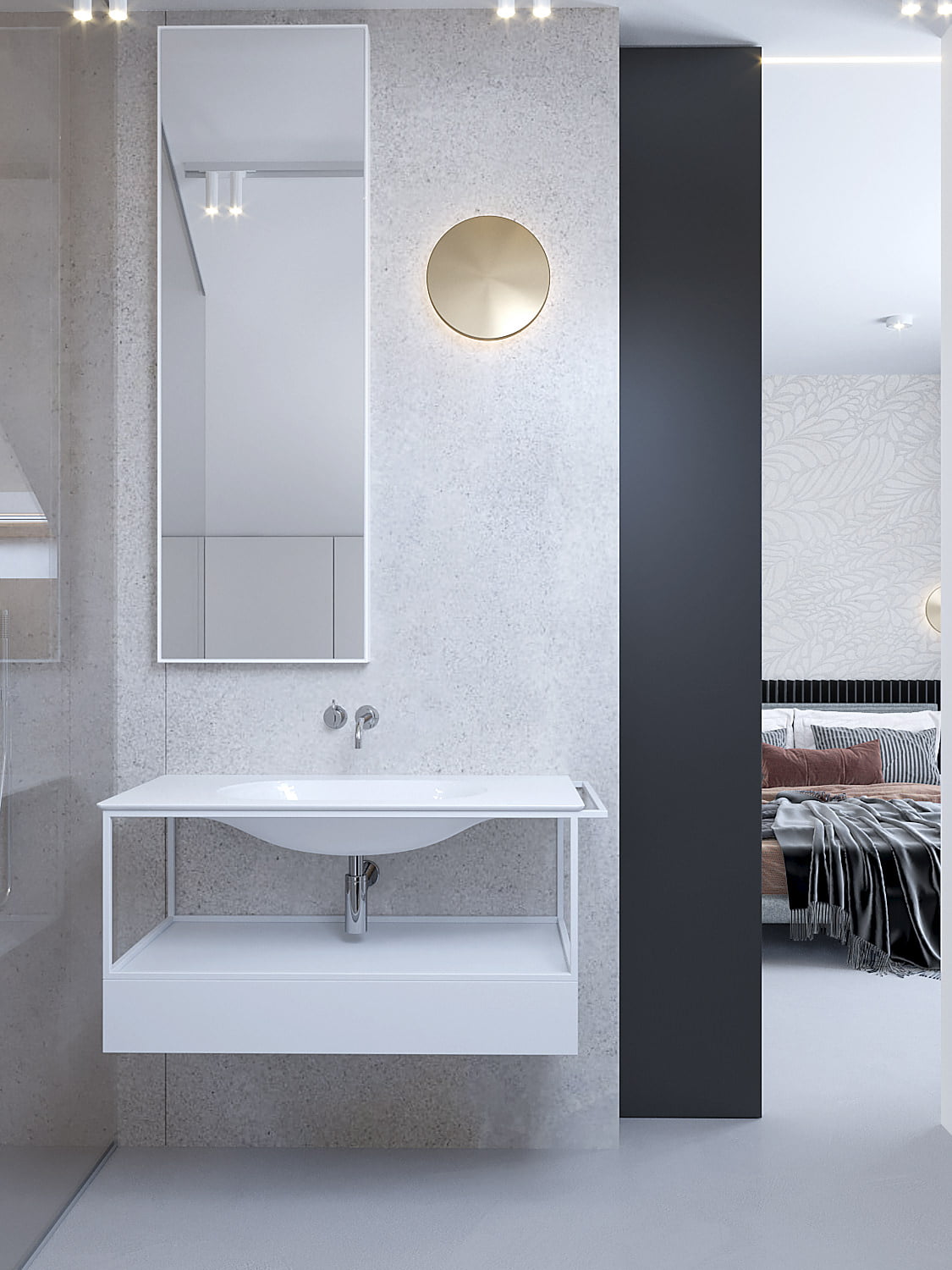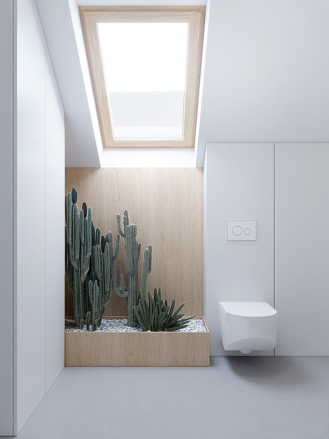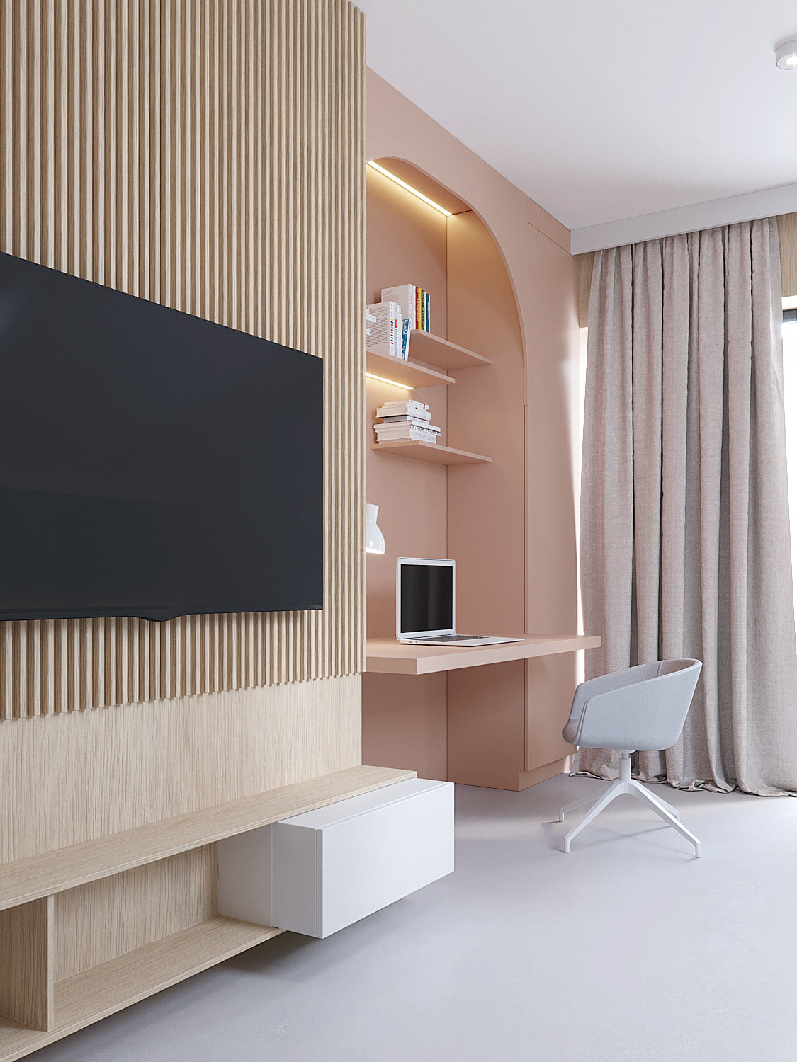 Pastelowe barwy, przeplatane z jasnym drewnem w postaci lameli dekoracyjnych, ocieplają całą przestrzeń, nadając klimatu. Sypialnia Inwestorów utrzymana jest w chłodnych barwach, jednak wzory znajdujące się na jednej ze ścian nadają niepowtarzalnego wyrazu całej przestrzeni. Łazienka prywatna, dzięki jasnym barwom oraz oknie w centralnym miejscu, wydaje się dużo bardziej przestrzenna.