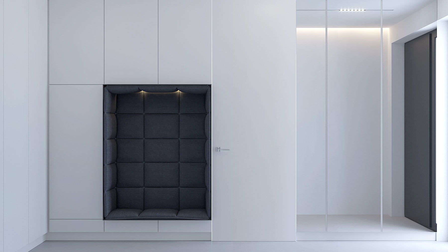 Do podmiany: na otwartym planie znalazła się kuchnia z zabudową, robiąca wrażenie część jadalniana w postaci półwyspu z ażurową konstrukcją oraz przytulny salon. Obok zaprojektowałyśmy sypialnię z wbudowanym łóżkiem i wysokim, materiałowym zagłówkiem.