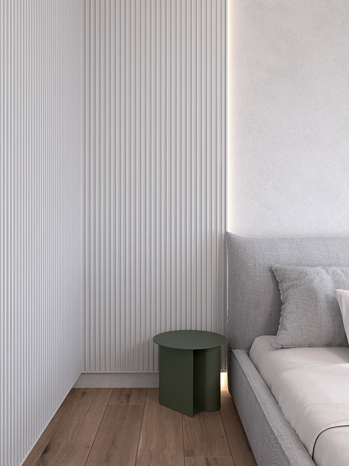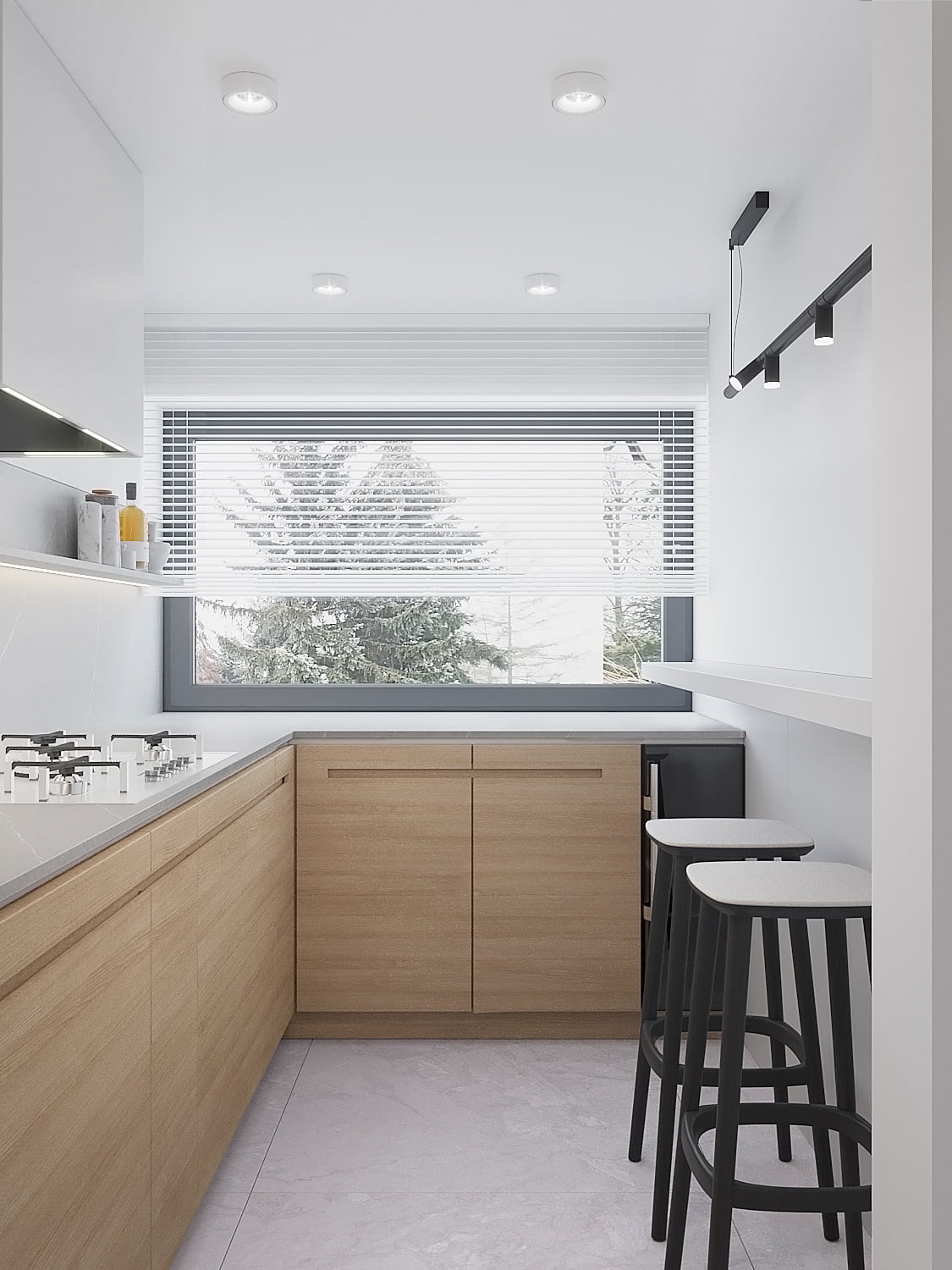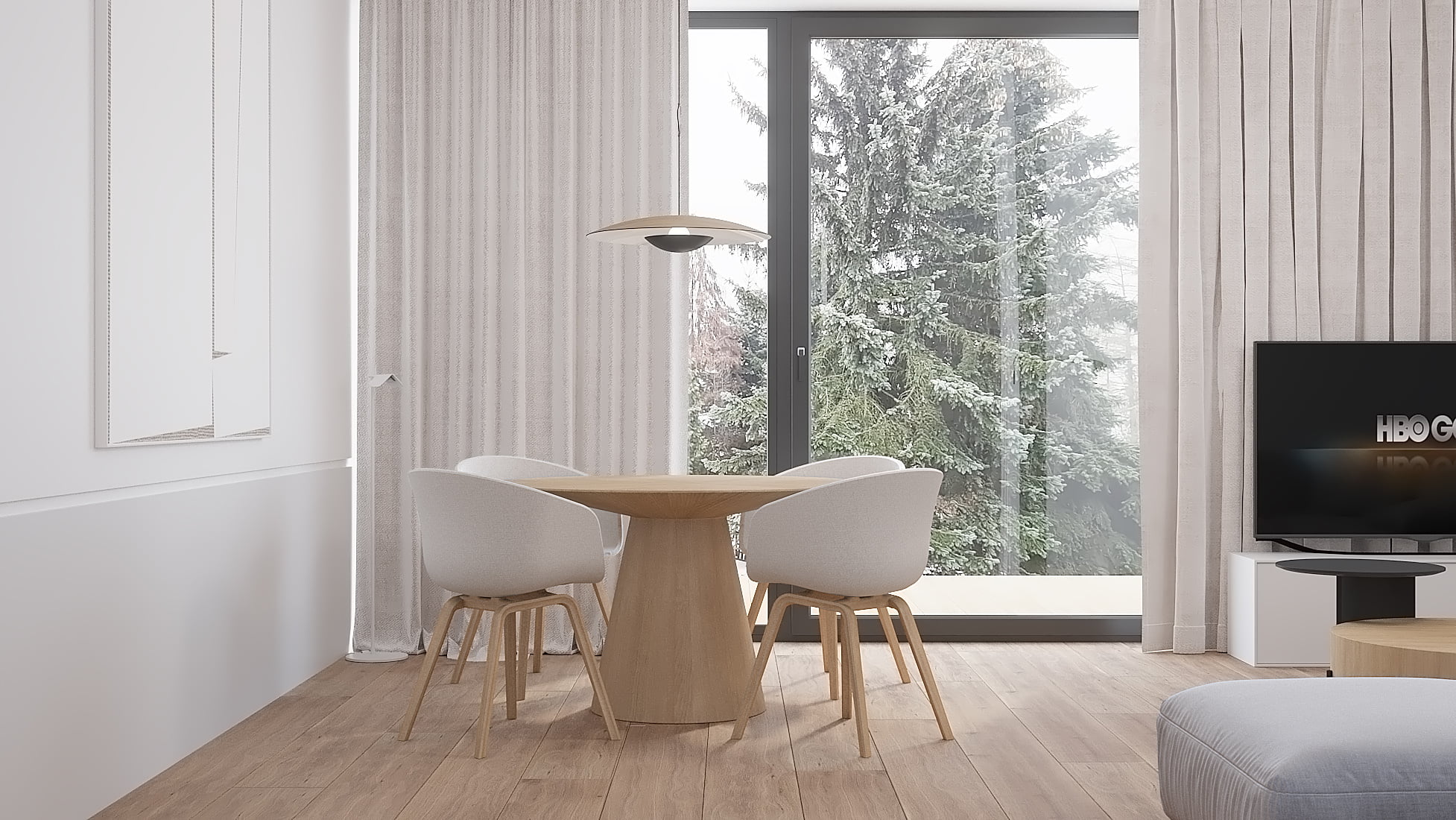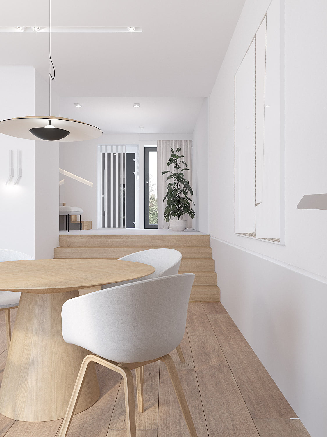 Do podmiany: na otwartym planie znalazła się kuchnia z zabudową, robiąca wrażenie część jadalniana w postaci półwyspu z ażurową konstrukcją oraz przytulny salon. Obok zaprojektowałyśmy sypialnię z wbudowanym łóżkiem i wysokim, materiałowym zagłówkiem.