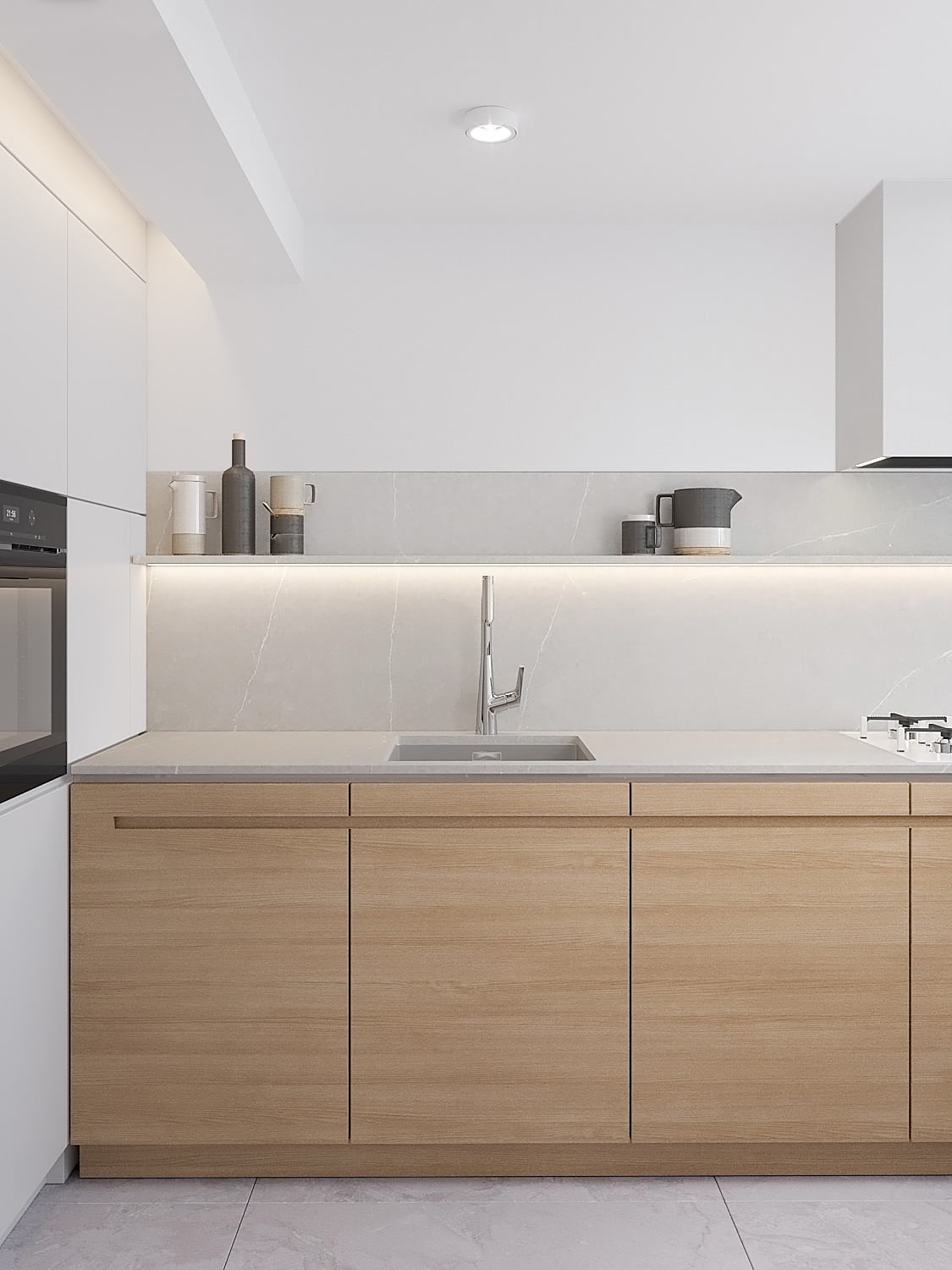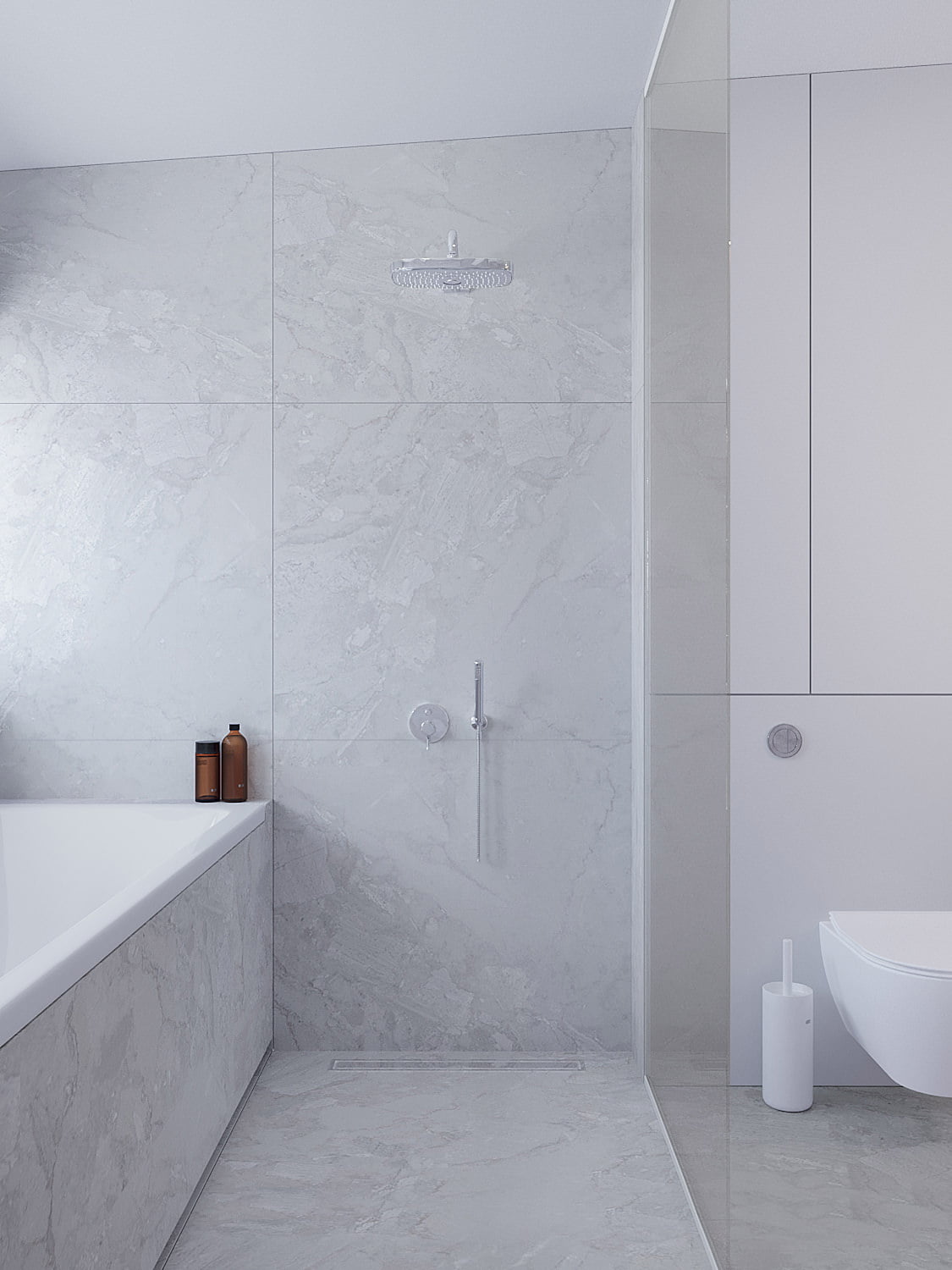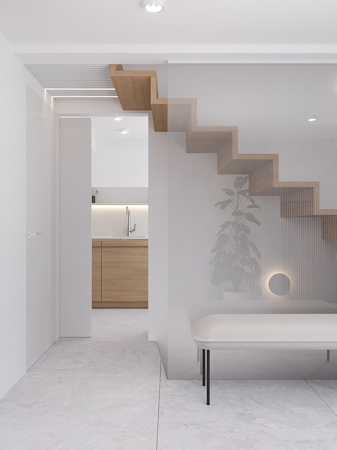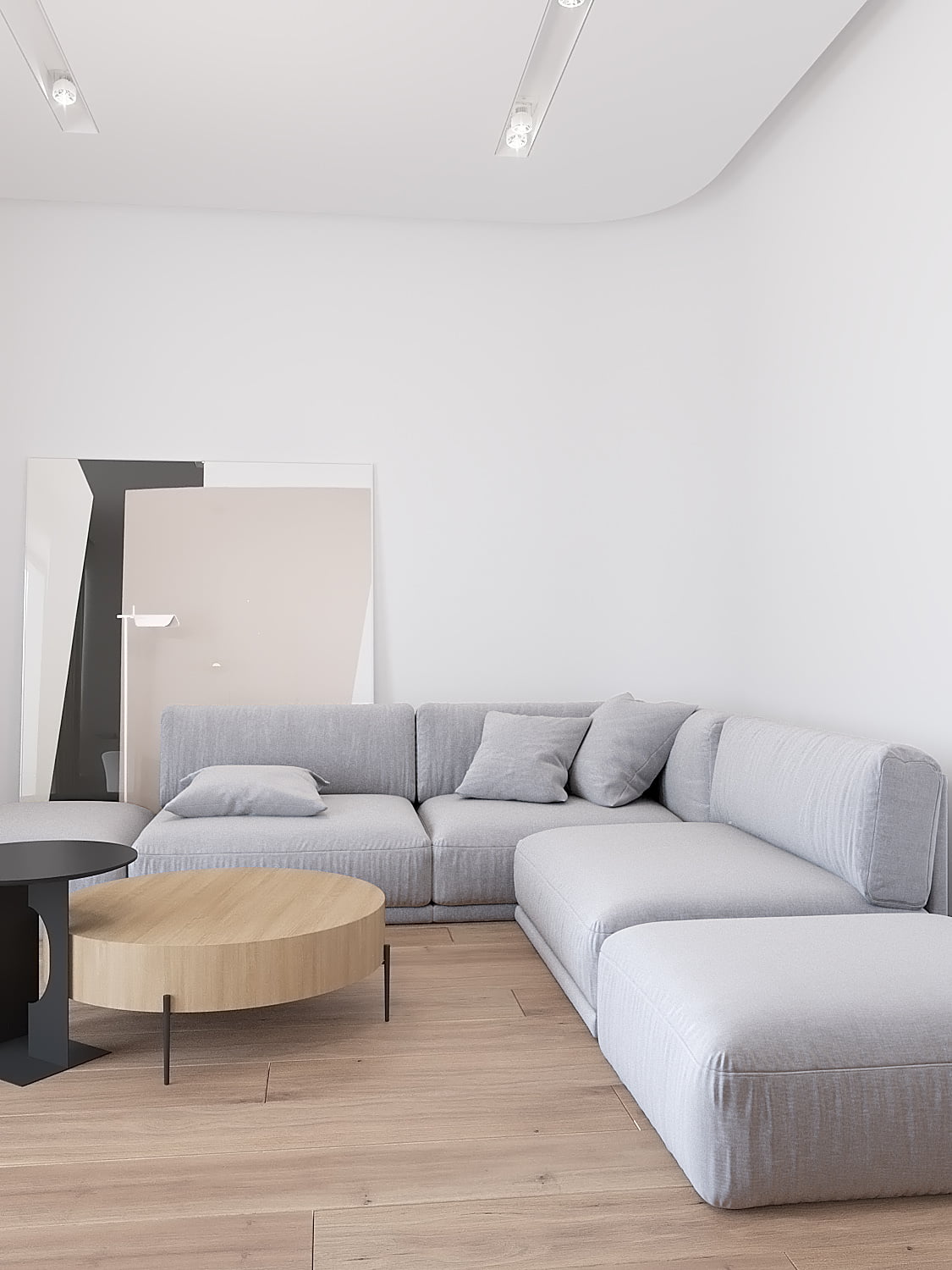 Do podmiany: na otwartym planie znalazła się kuchnia z zabudową, robiąca wrażenie część jadalniana w postaci półwyspu z ażurową konstrukcją oraz przytulny salon. Obok zaprojektowałyśmy sypialnię z wbudowanym łóżkiem i wysokim, materiałowym zagłówkiem.