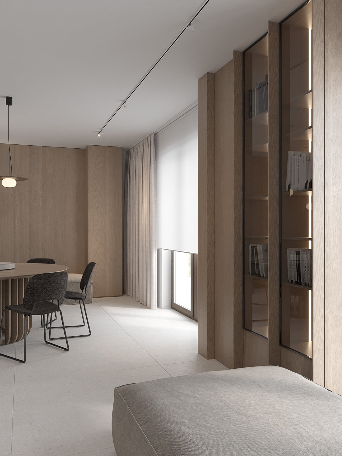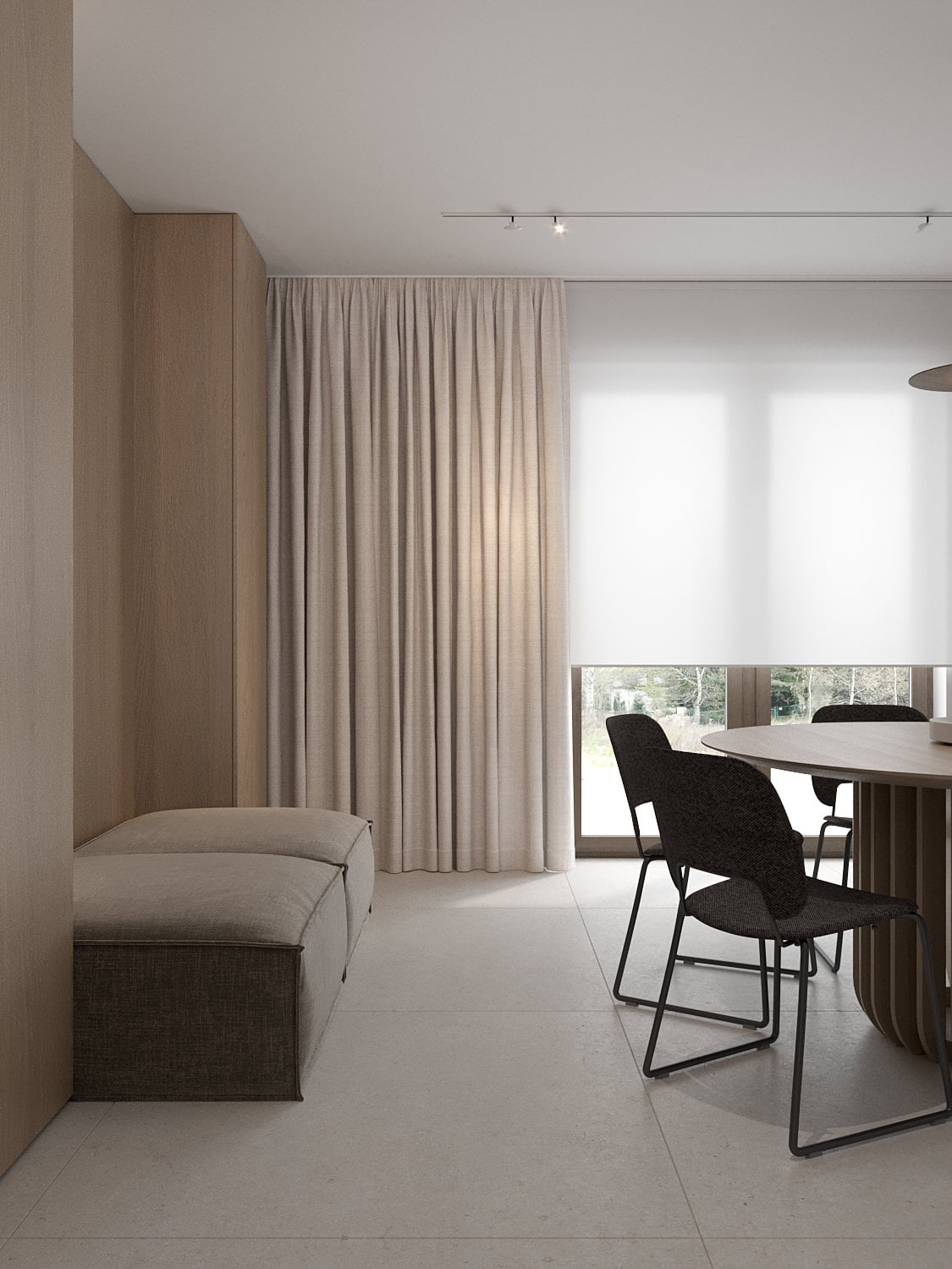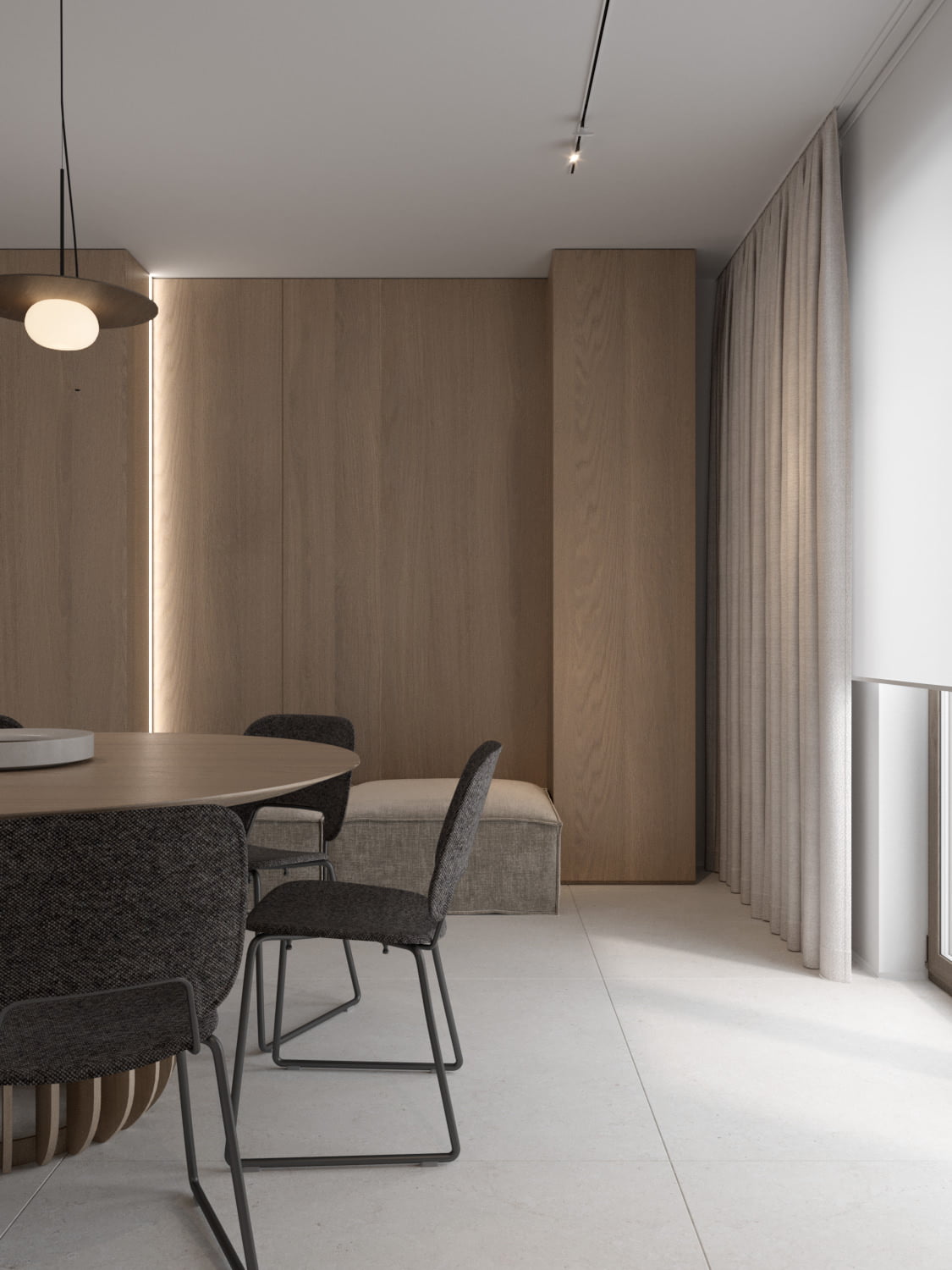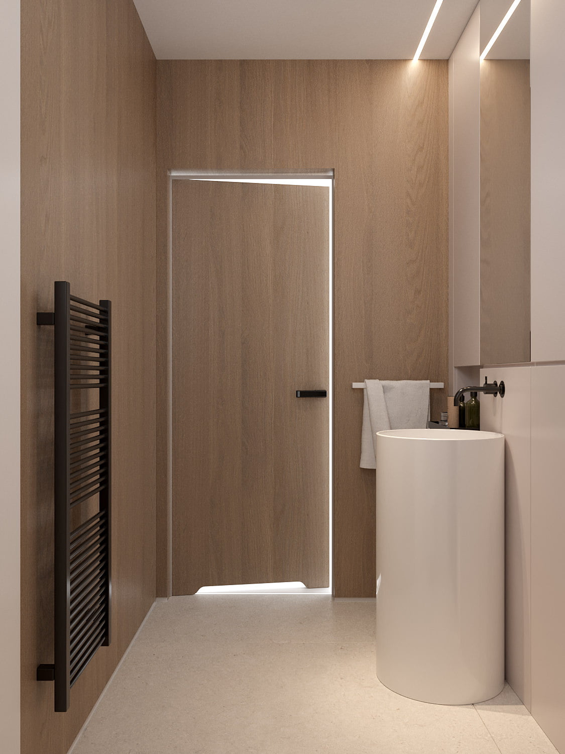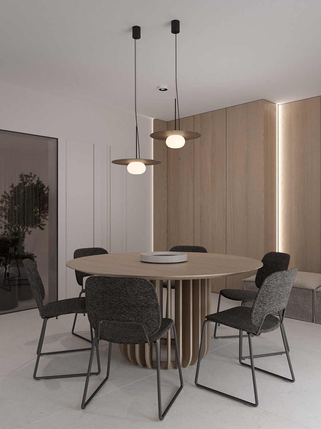Część wspólna oraz łazienka z projektu domu pod Katowicami. Inwestorom zależało na prostocie, nowoczesności oraz neutralnej kolorystyce. Postawiłyśmy na ciekawe wykorzystanie materiałów – na ścianę trafiła drewniana zabudowa, a na podłogę wielkoformatowe, jasne płytki. W aranżacji wykorzystałyśmy prostą w formie, duża kanapę, okrągły stół z zestawem krzeseł i przeszklone półki, podświetlone profilem ledowym. Całość dopełnia ciekawe oświetlenie.