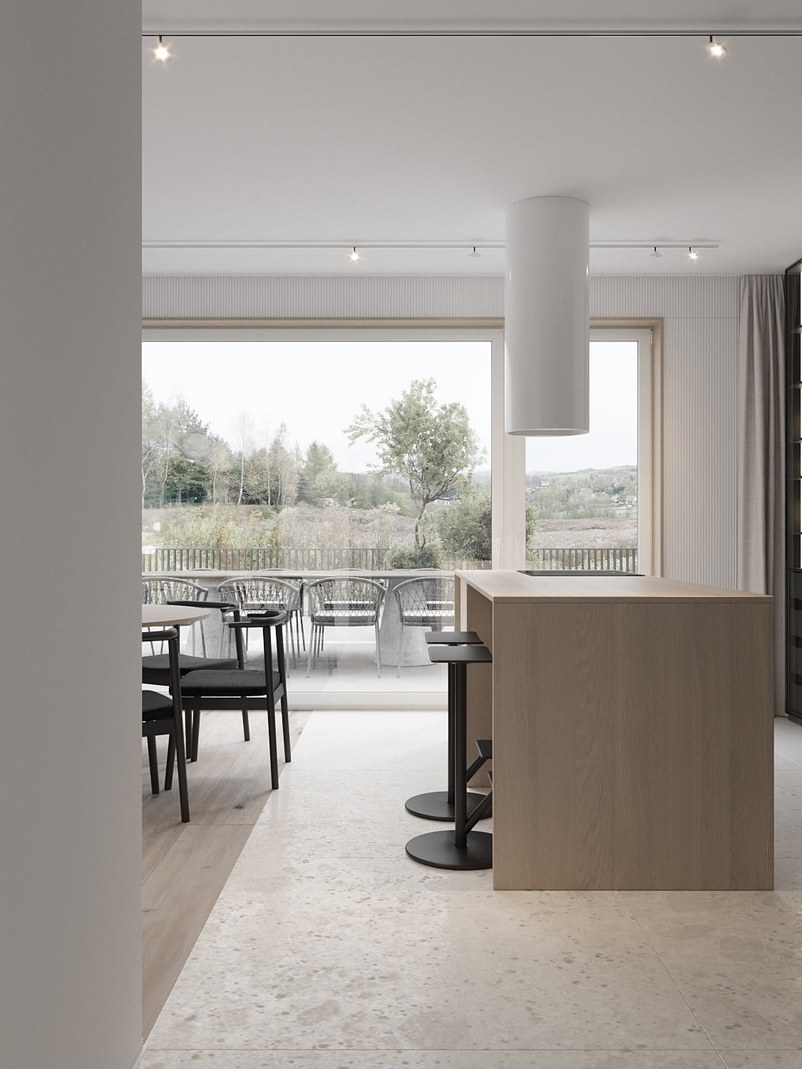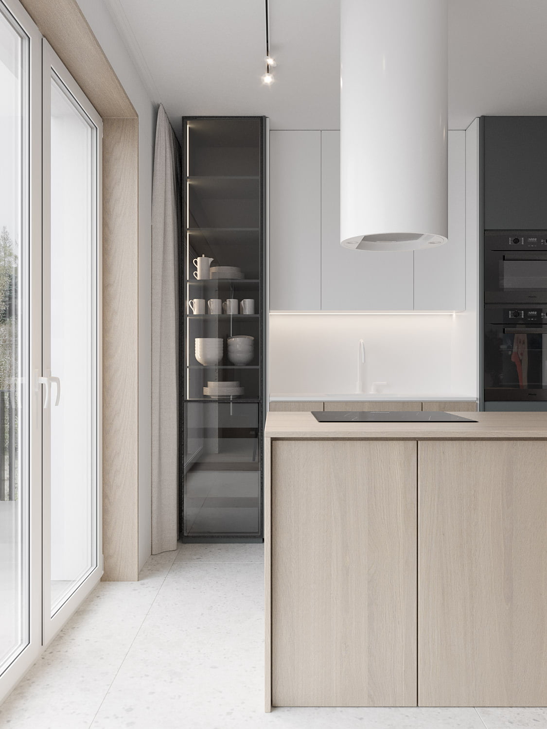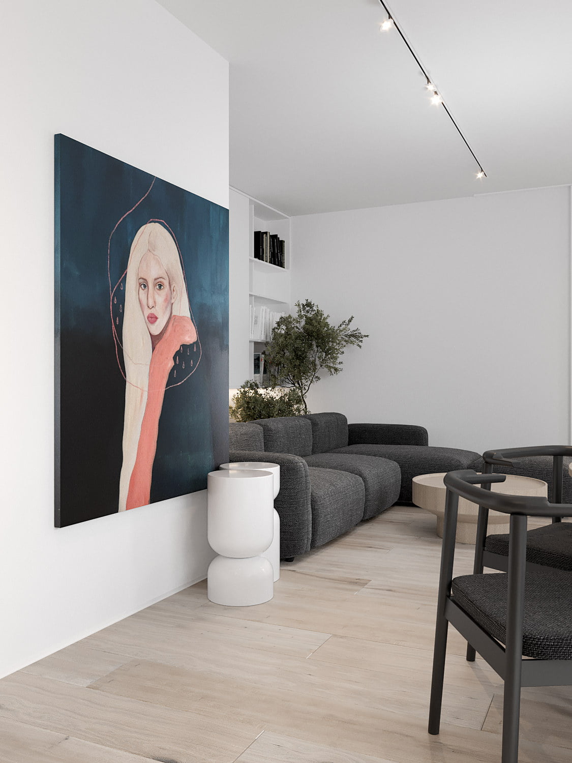 Ten projekt dwupoziomowego mieszkania to nowoczesna, elegancka aranżacja w bielach, czerni i szarościach, której ciepła dodaje duża ilość drewna. Na parterze znalazł się otwarty salon z aneksem kuchennym i jadalnianym stołem. Dwukolorowe fronty kuchenne urozmaiciłyśmy o przeszklony moduł podświetlanym taśmą ledową. Zgodnie z prośbą inwestorów, kanapa ustawiona została naprzeciw dużego, panoramicznego okna. Obok zawisł piękny obraz autorstwa Ewy Machety, który tworzy klimat całego wnętrza.