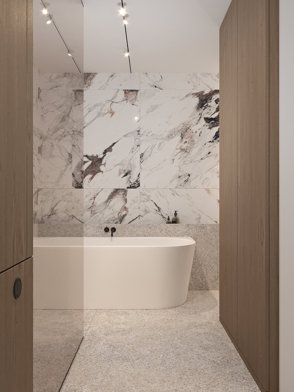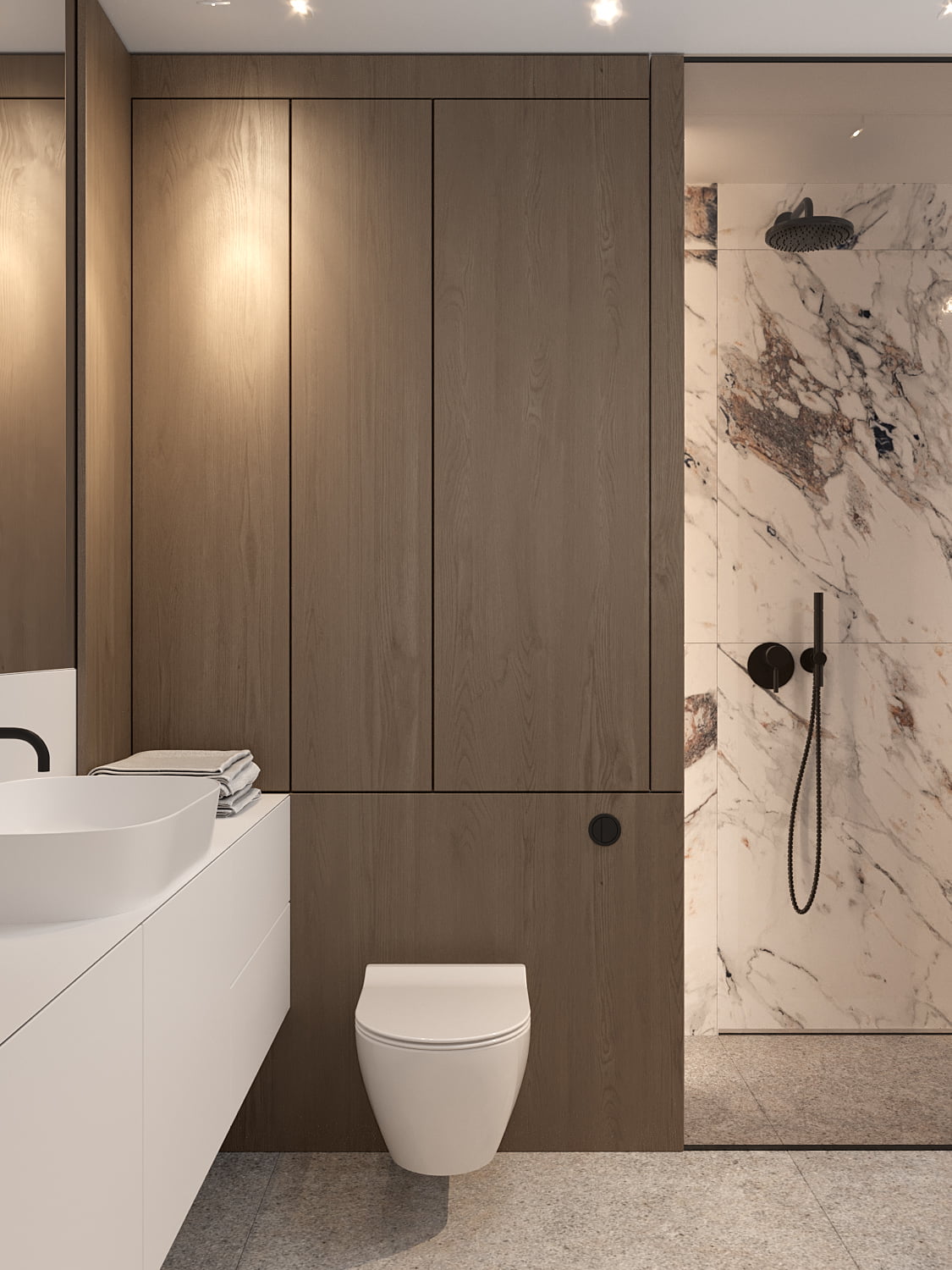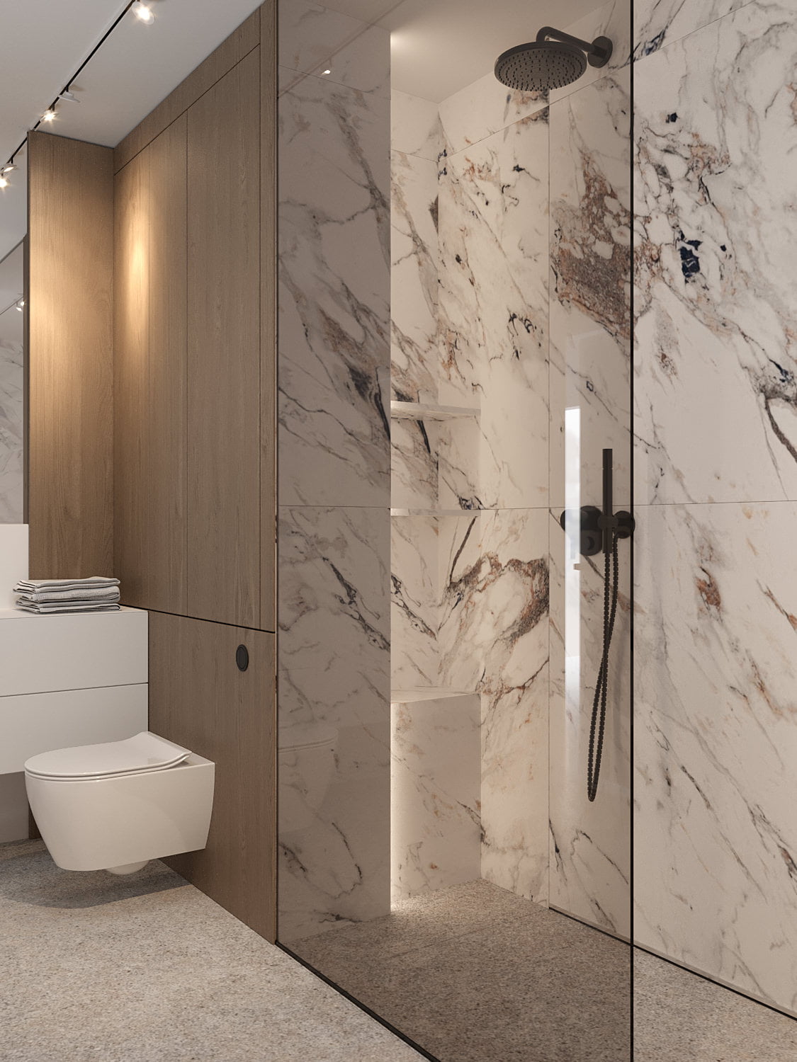 Ten projekt dwupoziomowego mieszkania to nowoczesna, elegancka aranżacja w bielach, czerni i szarościach, której ciepła dodaje duża ilość drewna. Na parterze znalazł się otwarty salon z aneksem kuchennym i jadalnianym stołem. Dwukolorowe fronty kuchenne urozmaiciłyśmy o przeszklony moduł podświetlanym taśmą ledową. Zgodnie z prośbą inwestorów, kanapa ustawiona została naprzeciw dużego, panoramicznego okna. Obok zawisł piękny obraz autorstwa Ewy Machety, który tworzy klimat całego wnętrza.