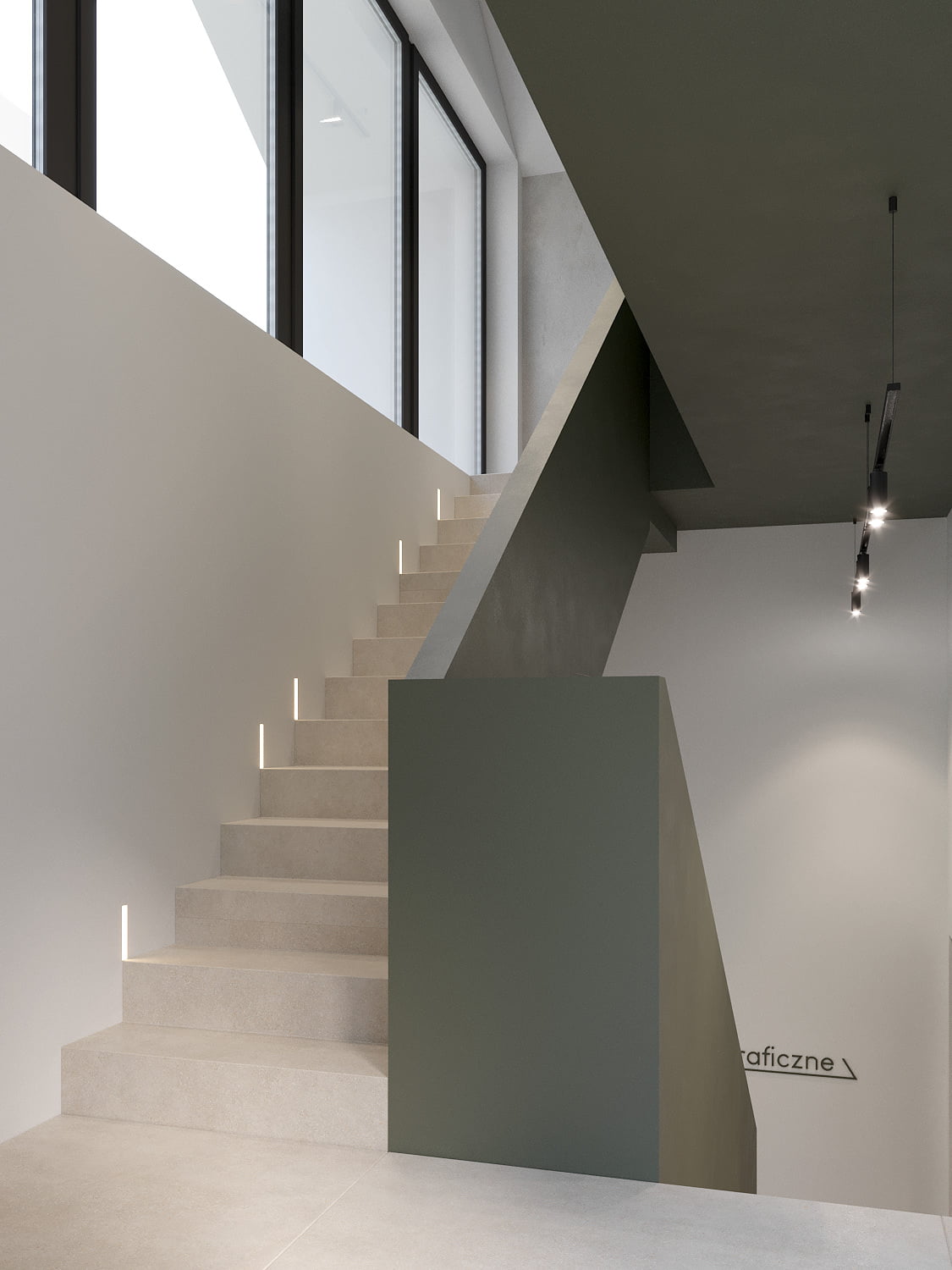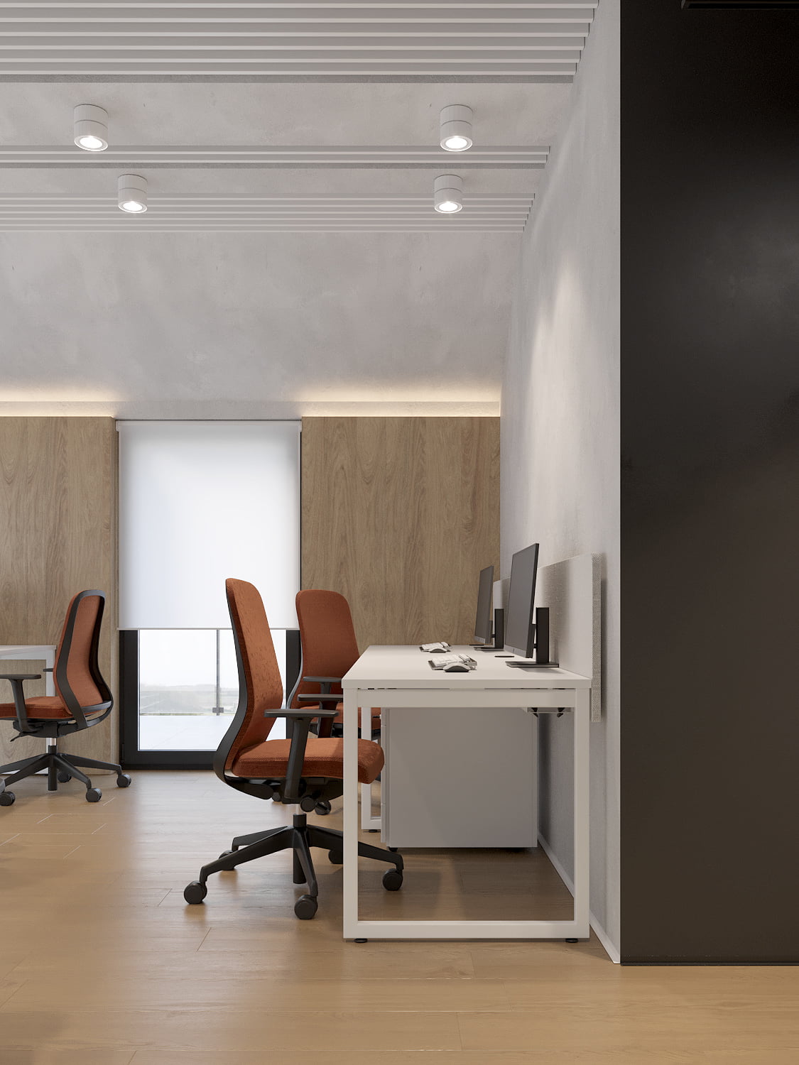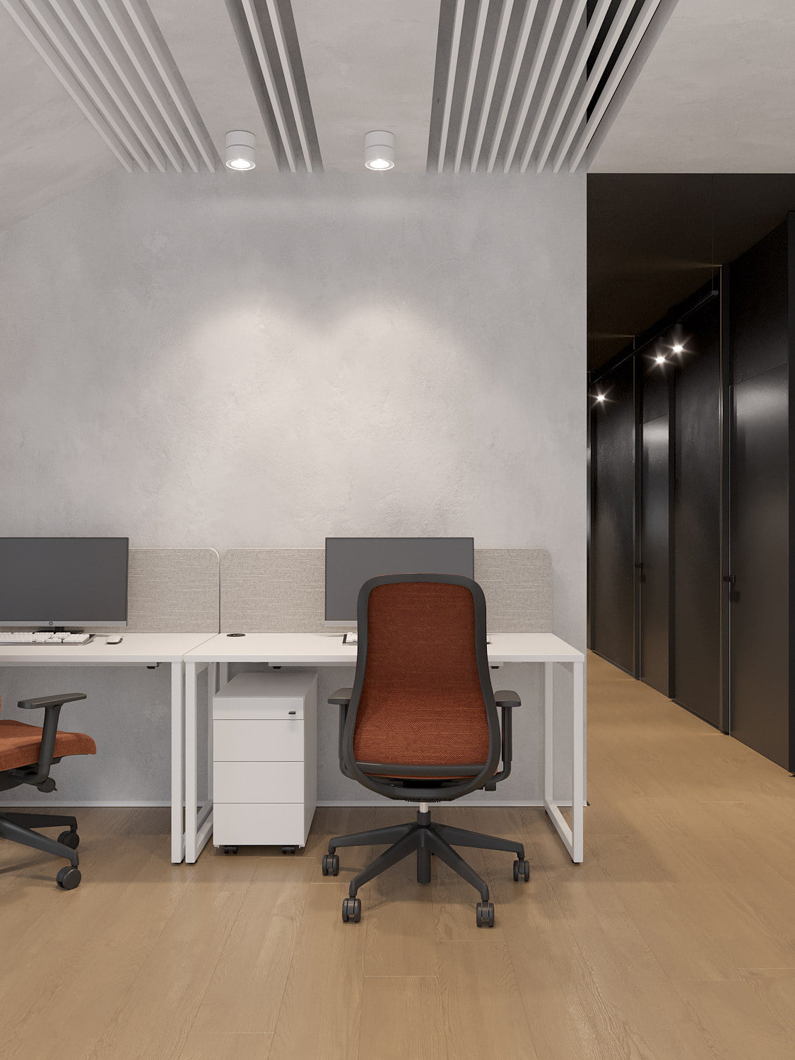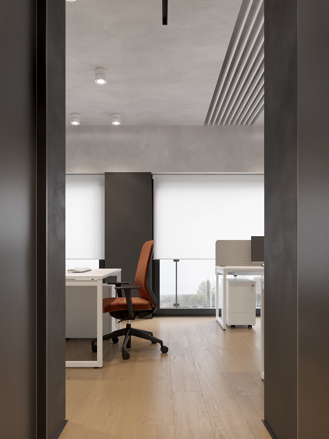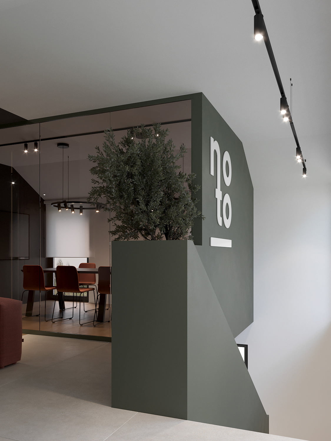 Nowoczesna aranżacja przestrzeni biurowej. W częściach wspólnych pojawiają się industrialne elementy – metalowe nogi stołów i oświetlenie, współgrające z nowoczesnymi, prostymi liniami mebli i wykończenia. Funkcjonalne biura na piętrze zapewniają przestrzeń do kreatywnej pracy z minimalistycznym designem, podkreślającym profesjonalizm i kreatywny charakter marki. Bazą stały się odcienie czerni i bieli, przełamane akcentami w kolorze głębokiej zieleni – korespondujące z otoczeniem budynki, oraz rdzawej czerwieni – wpisanej w tożsamość marki.