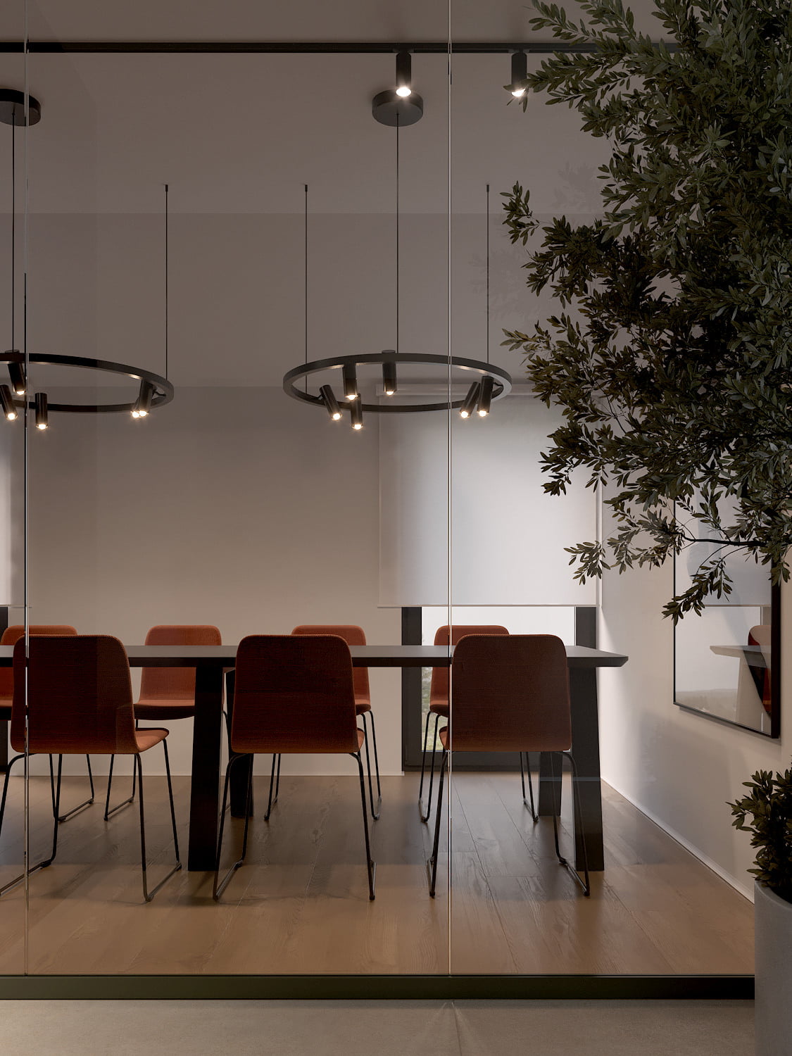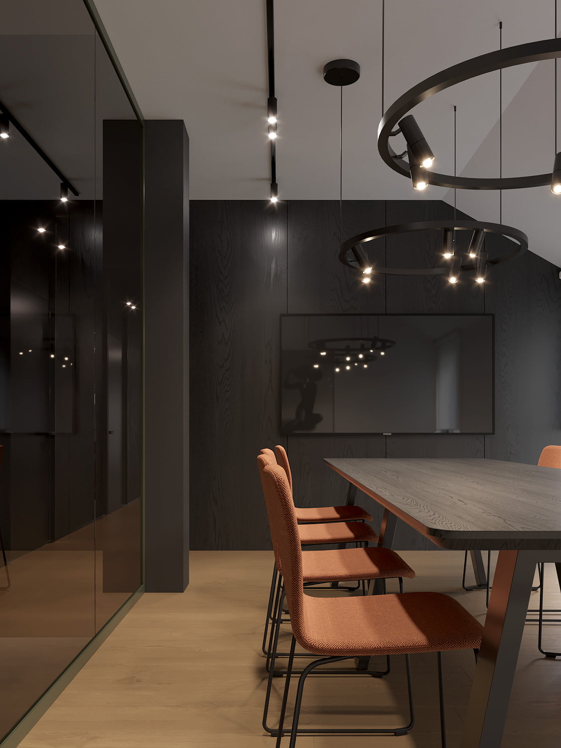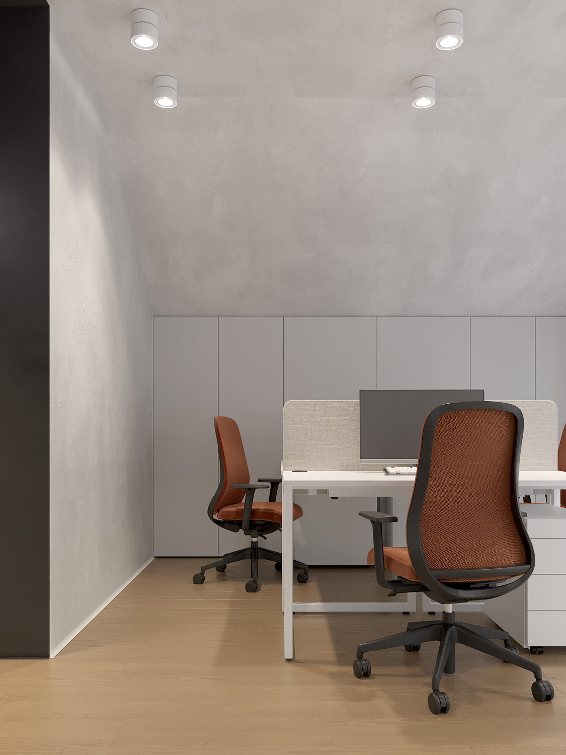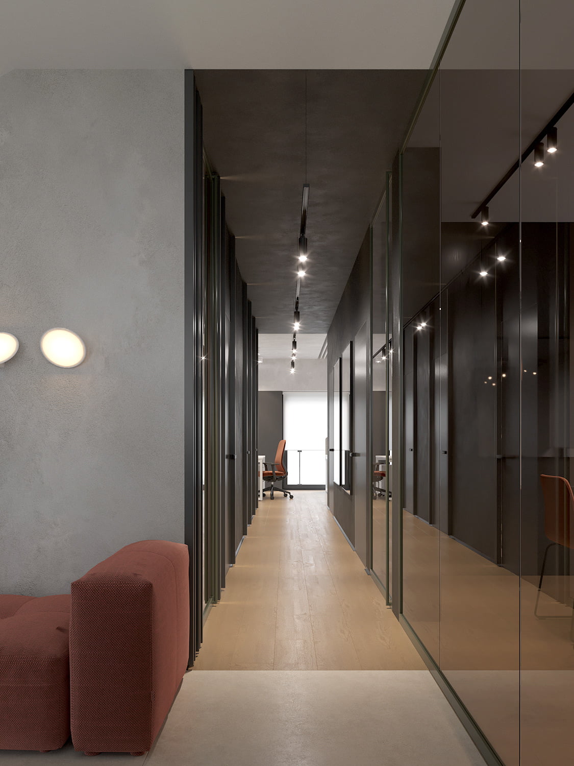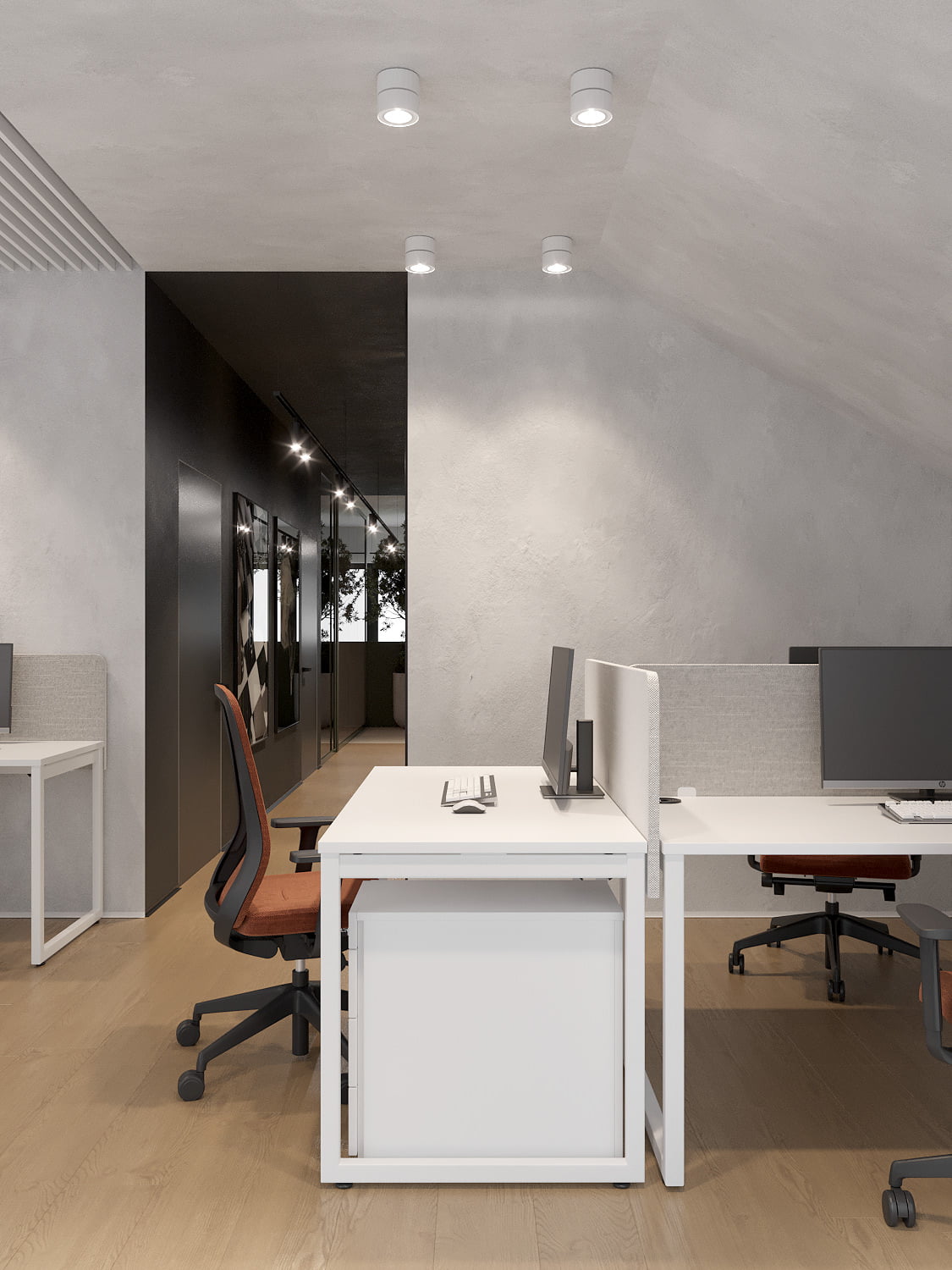 Nowoczesna aranżacja przestrzeni biurowej. W częściach wspólnych pojawiają się industrialne elementy – metalowe nogi stołów i oświetlenie, współgrające z nowoczesnymi, prostymi liniami mebli i wykończenia. Funkcjonalne biura na piętrze zapewniają przestrzeń do kreatywnej pracy z minimalistycznym designem, podkreślającym profesjonalizm i kreatywny charakter marki. Bazą stały się odcienie czerni i bieli, przełamane akcentami w kolorze głębokiej zieleni – korespondujące z otoczeniem budynki, oraz rdzawej czerwieni – wpisanej w tożsamość marki.