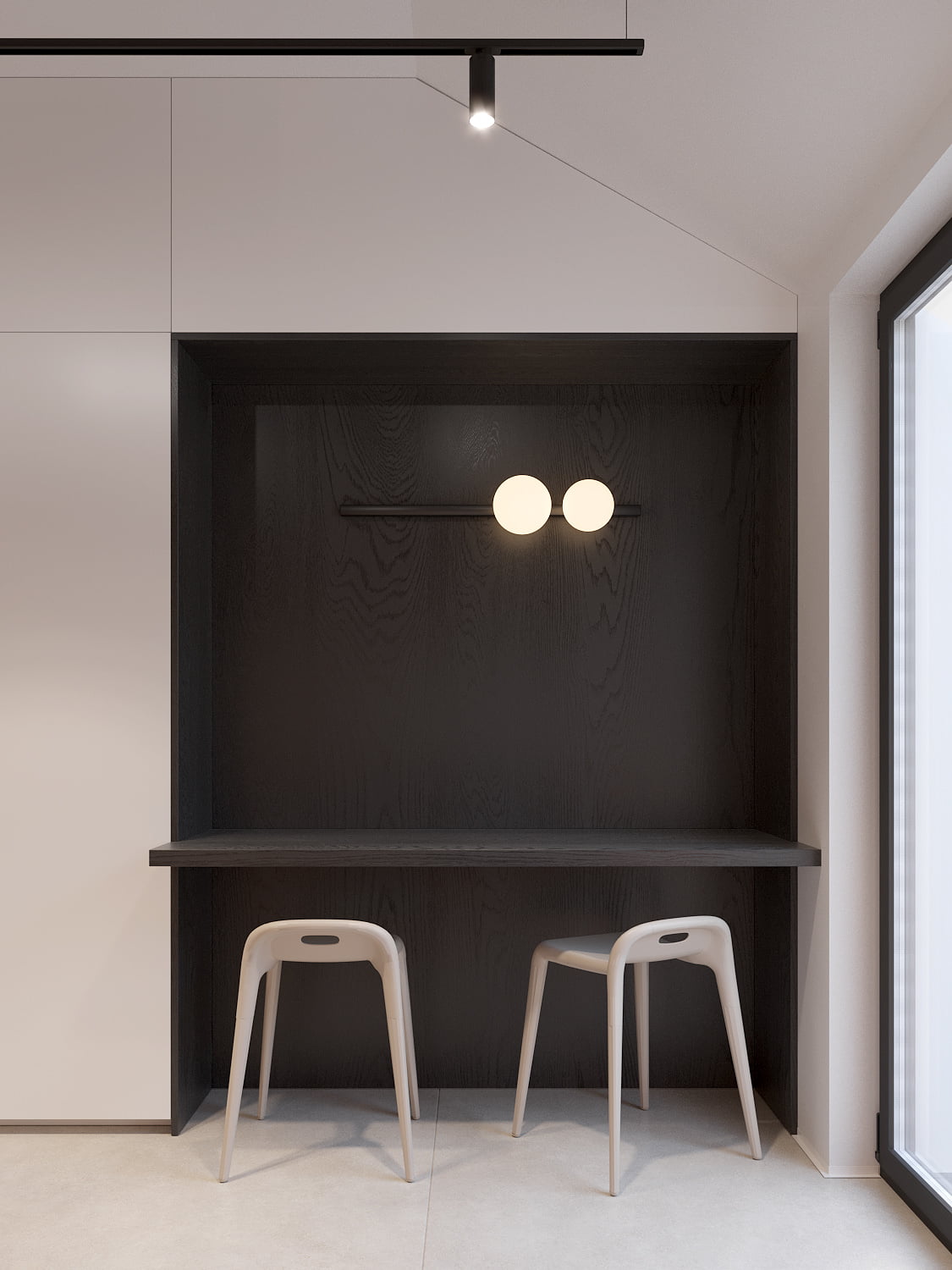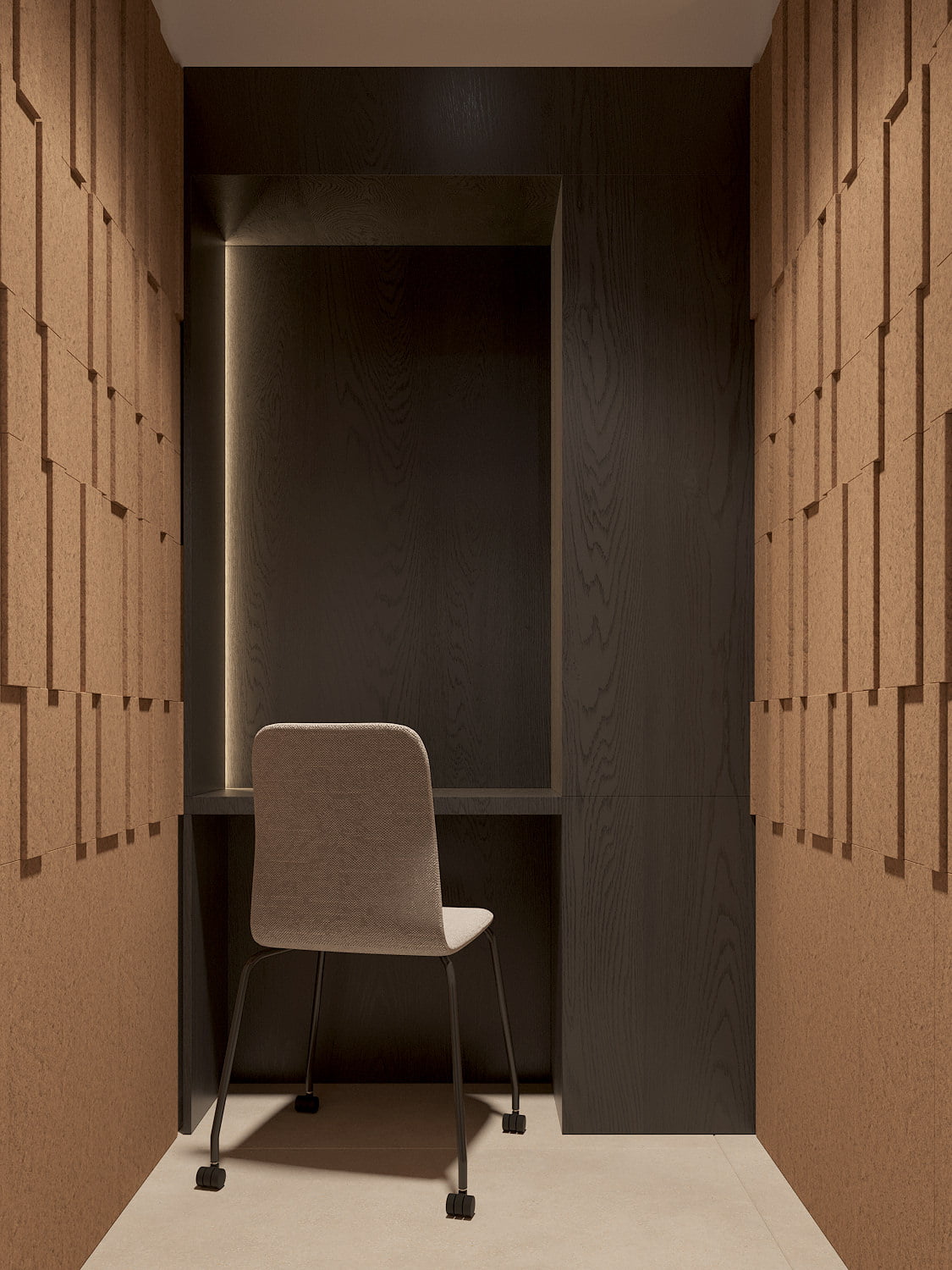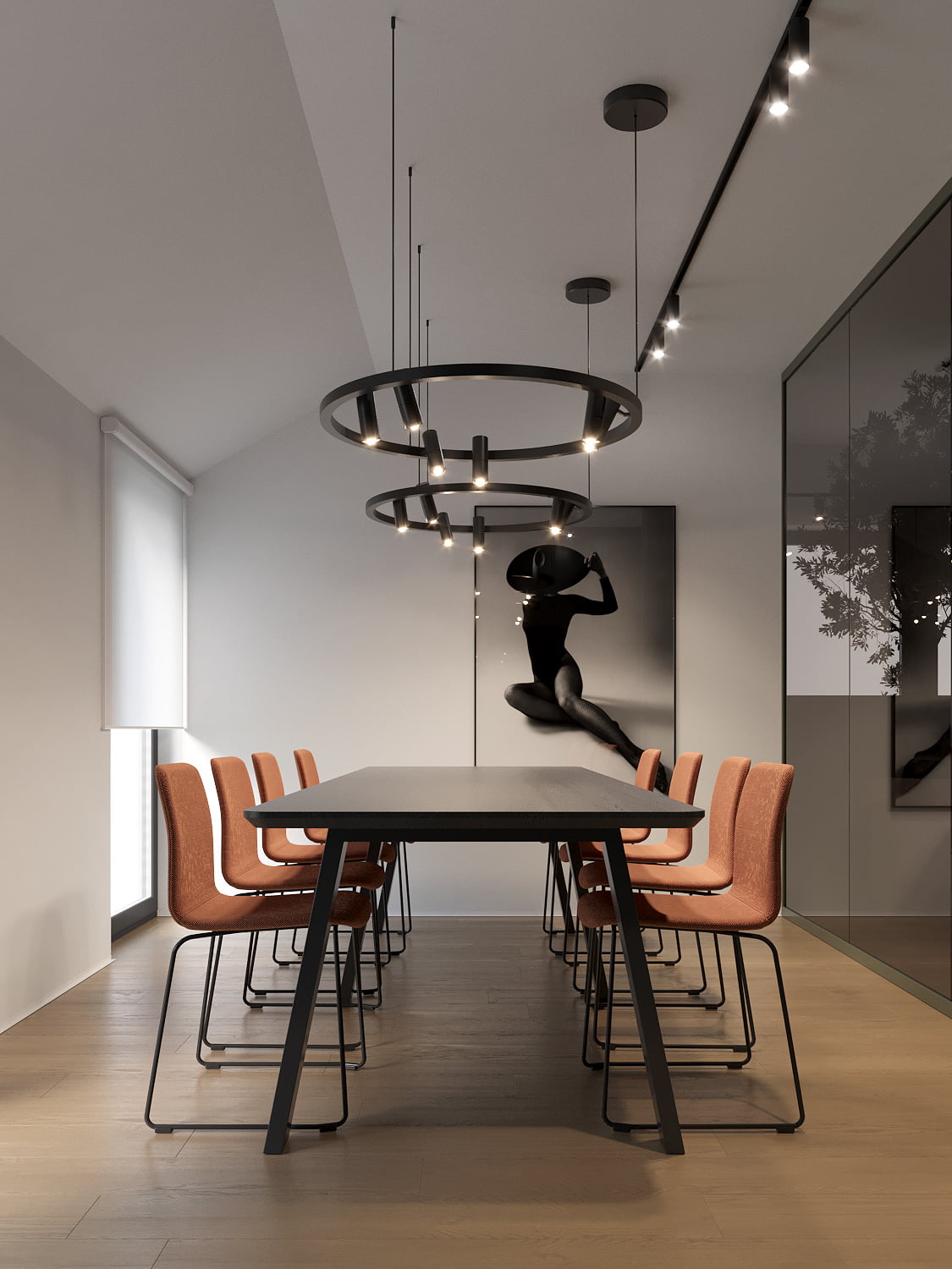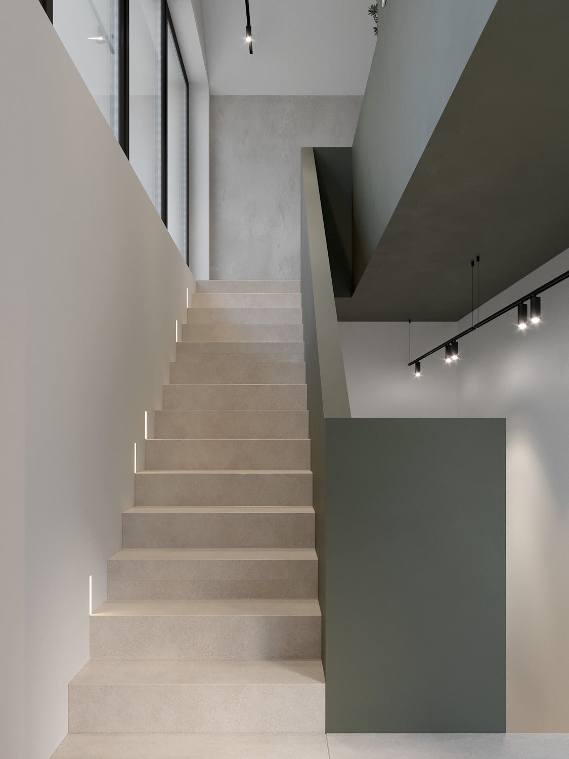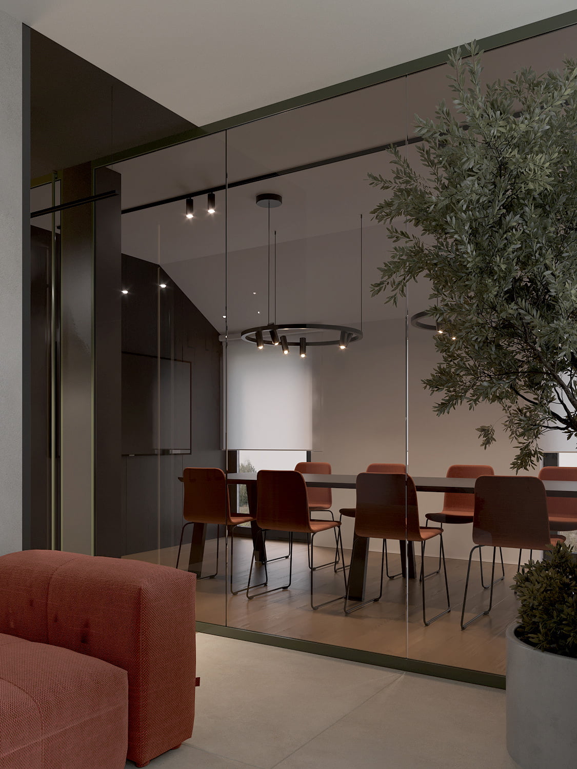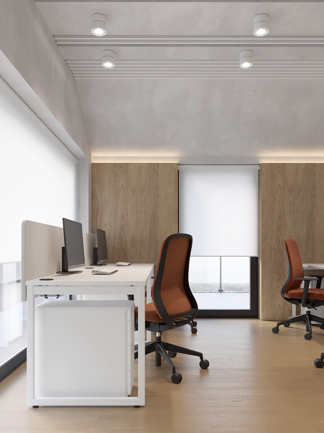 Nowoczesna aranżacja przestrzeni biurowej. W częściach wspólnych pojawiają się industrialne elementy – metalowe nogi stołów i oświetlenie, współgrające z nowoczesnymi, prostymi liniami mebli i wykończenia. Funkcjonalne biura na piętrze zapewniają przestrzeń do kreatywnej pracy z minimalistycznym designem, podkreślającym profesjonalizm i kreatywny charakter marki. Bazą stały się odcienie czerni i bieli, przełamane akcentami w kolorze głębokiej zieleni – korespondujące z otoczeniem budynki, oraz rdzawej czerwieni – wpisanej w tożsamość marki.