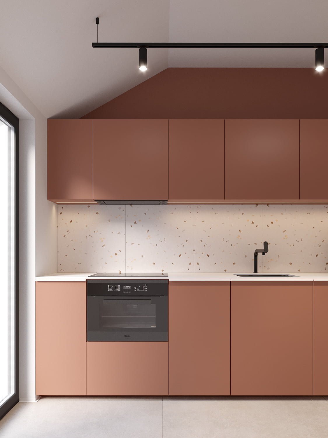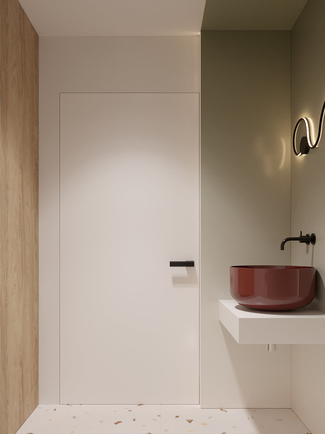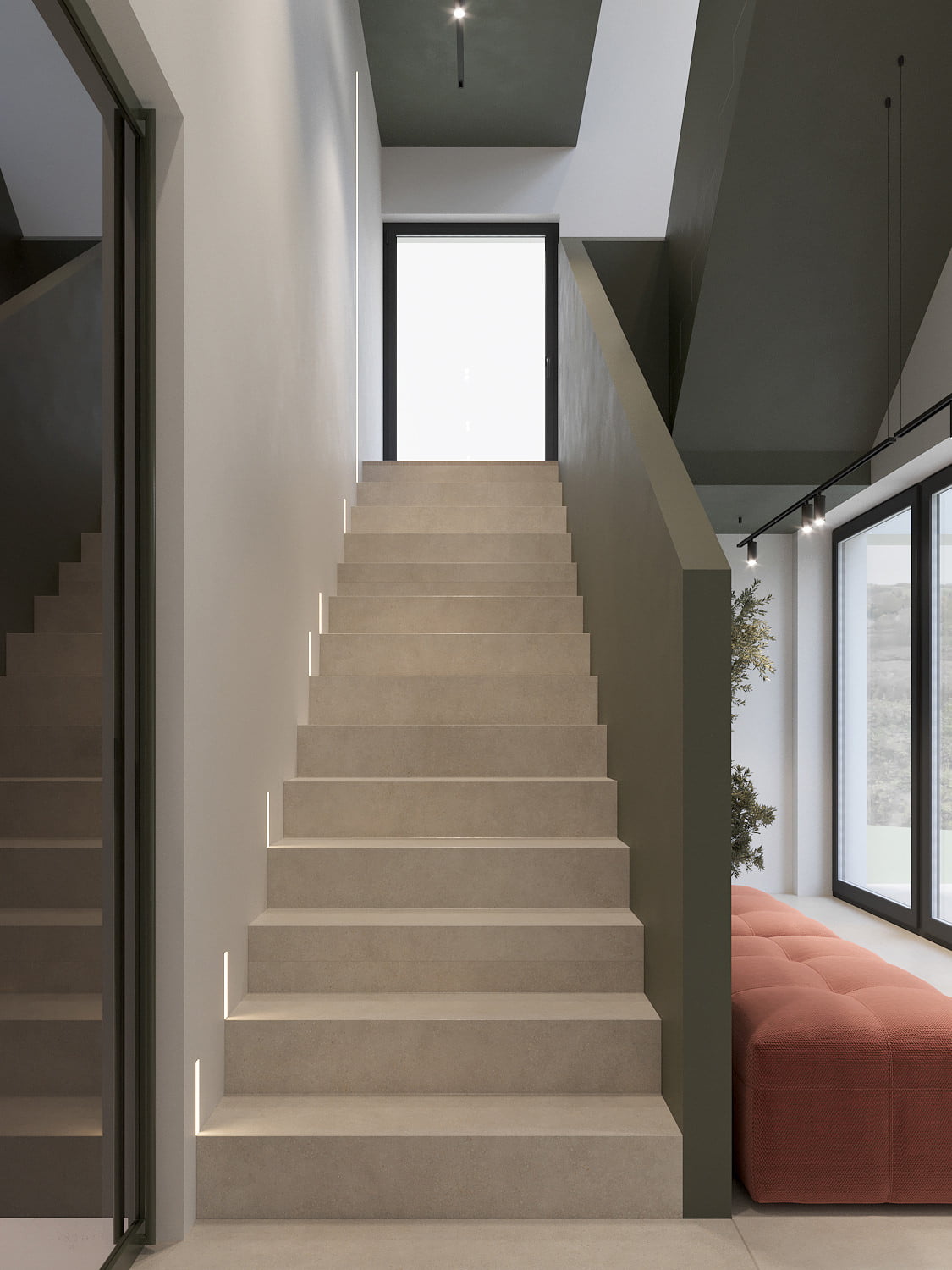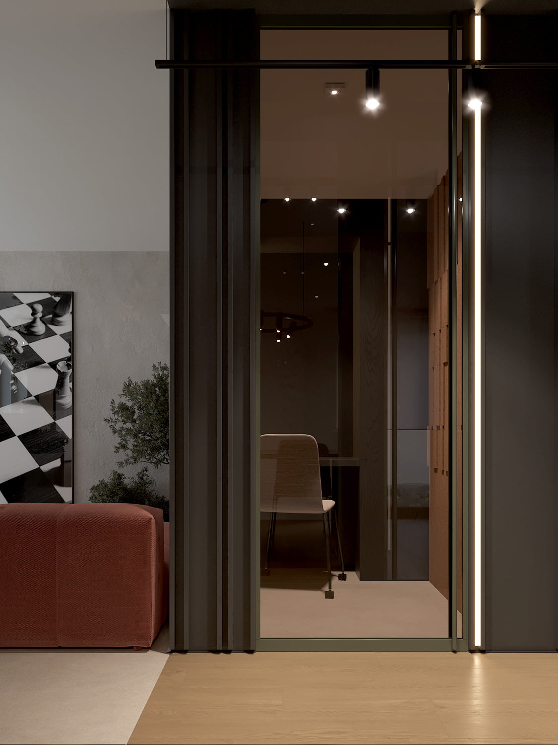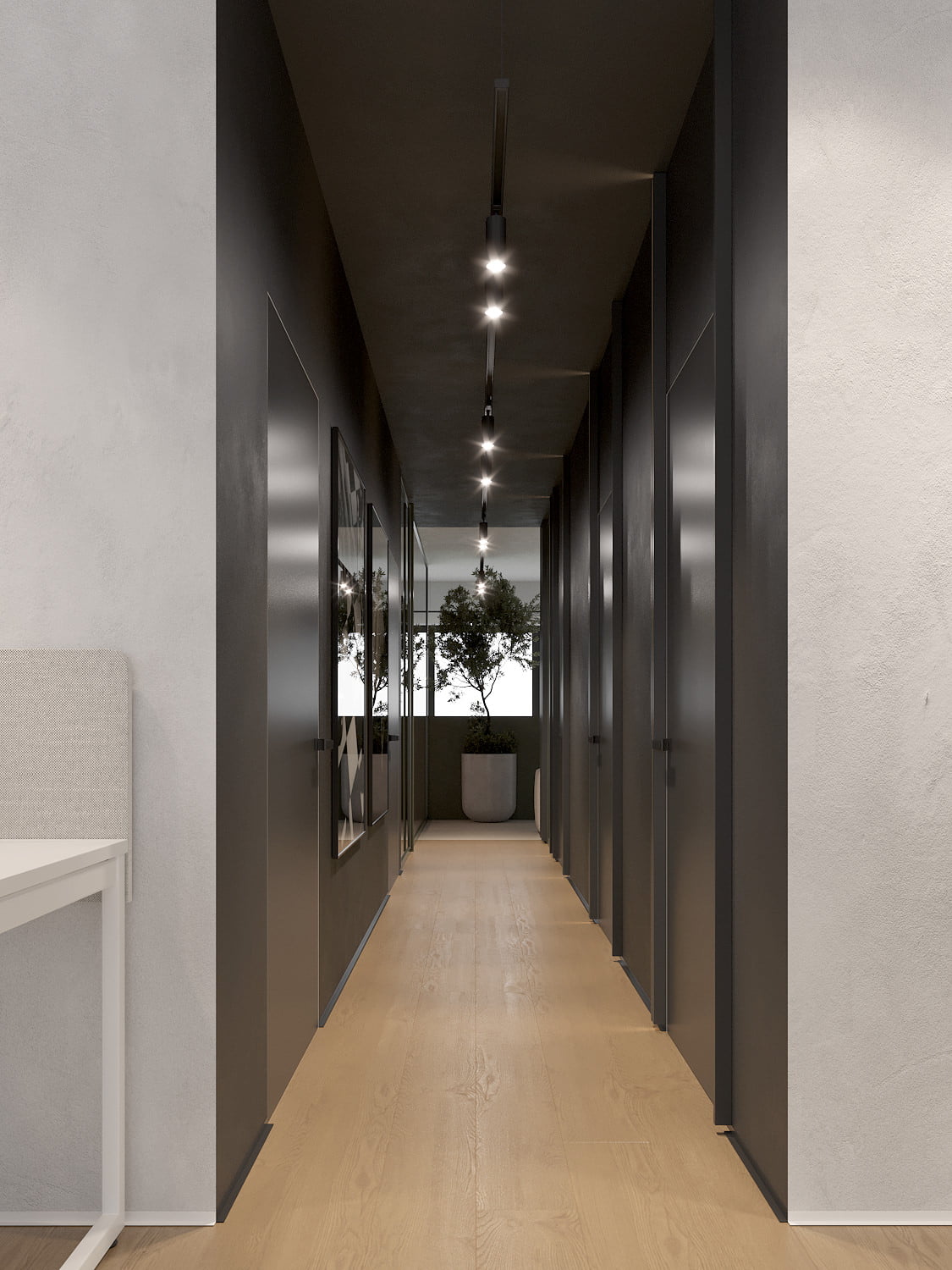 Nowoczesna aranżacja przestrzeni biurowej. W częściach wspólnych pojawiają się industrialne elementy – metalowe nogi stołów i oświetlenie, współgrające z nowoczesnymi, prostymi liniami mebli i wykończenia. Funkcjonalne biura na piętrze zapewniają przestrzeń do kreatywnej pracy z minimalistycznym designem, podkreślającym profesjonalizm i kreatywny charakter marki. Bazą stały się odcienie czerni i bieli, przełamane akcentami w kolorze głębokiej zieleni – korespondujące z otoczeniem budynki, oraz rdzawej czerwieni – wpisanej w tożsamość marki.