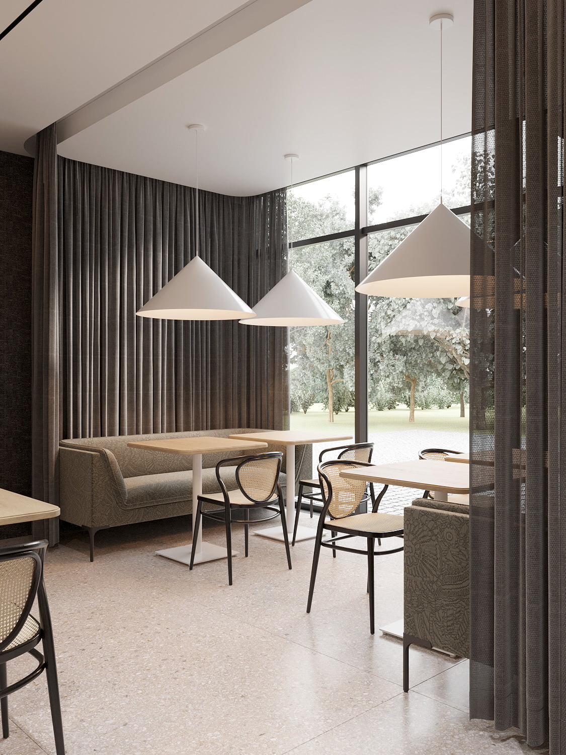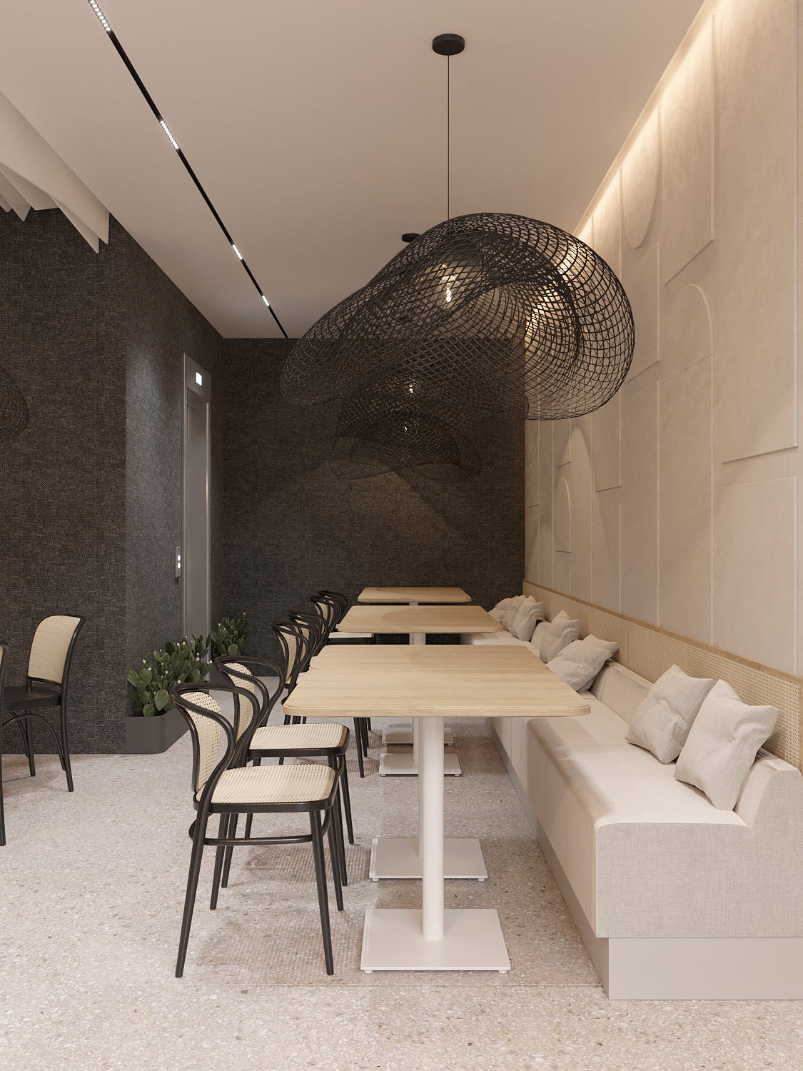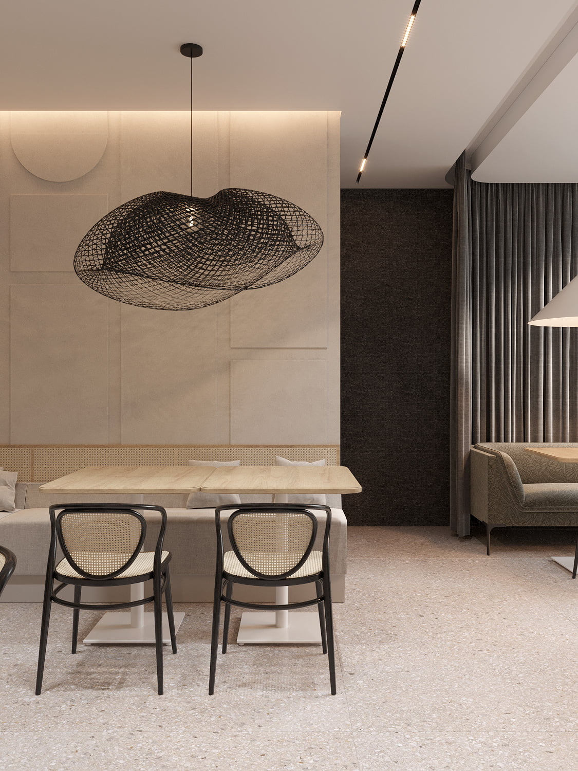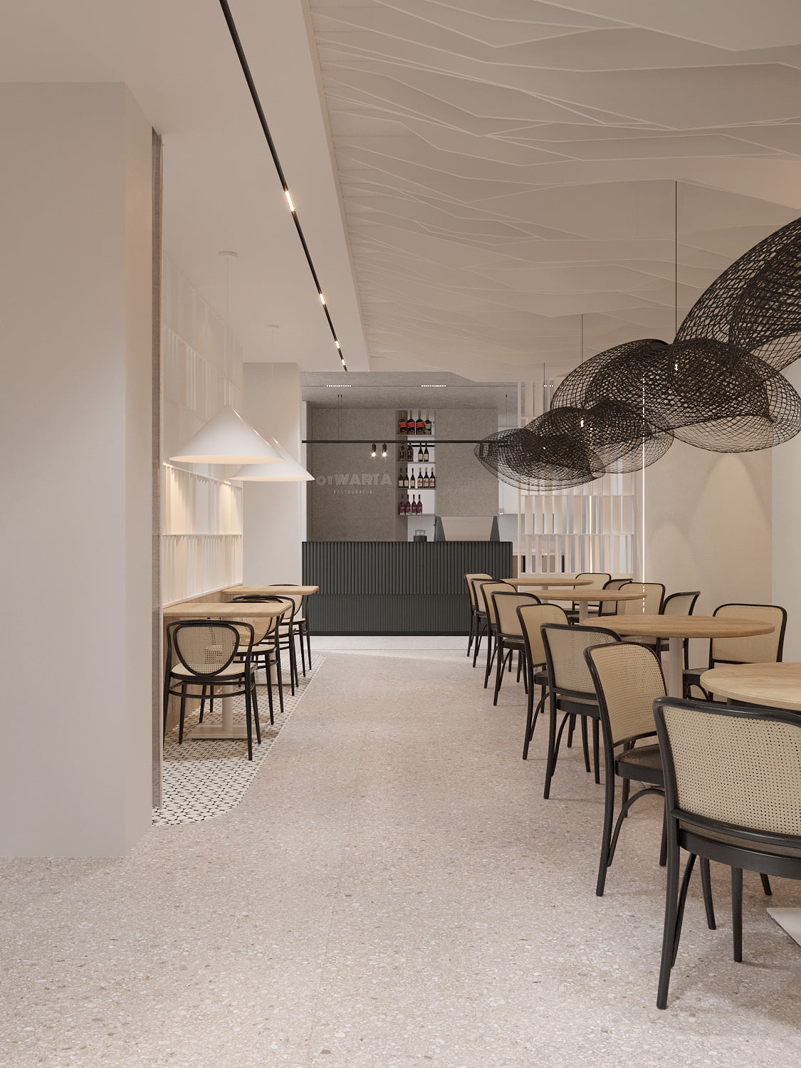 Projekt restauracji w Zawierciu. Dla inwestorów ważne było wyznaczenie kameralnych stref, ale także możliwość stworzenia przestrzeni dla większej ilości osób poprzez połączenie stolików. W stylistyce postawiłyśmy na wykorzystanie ponadczasowych materiałów oraz elementów stylu boho. Aranżacja utrzymana jest więc w beżach i szarościach, które jednak – by dodać nieco elegancji – uzupełniłyśmy o ciemne elementy.