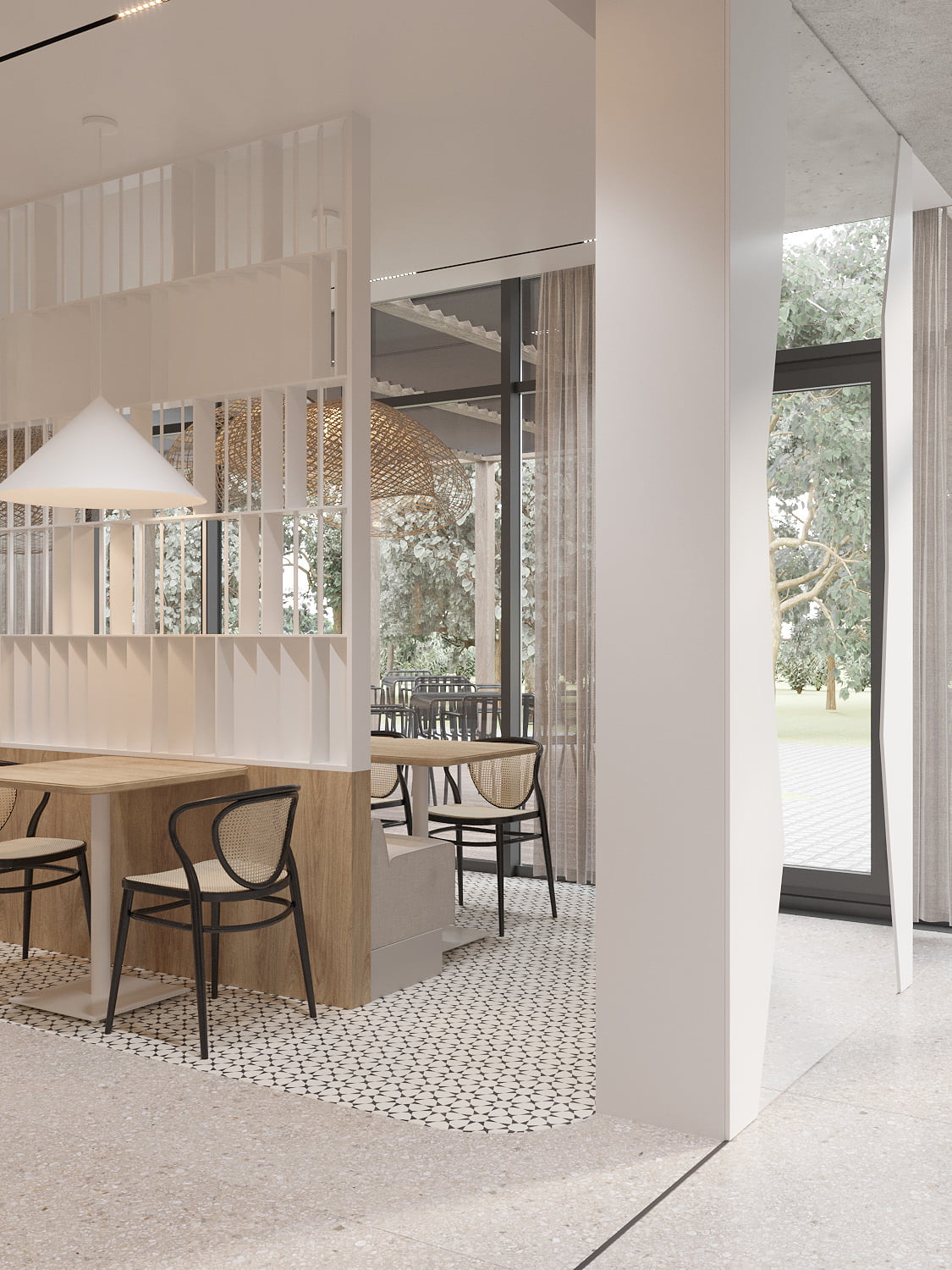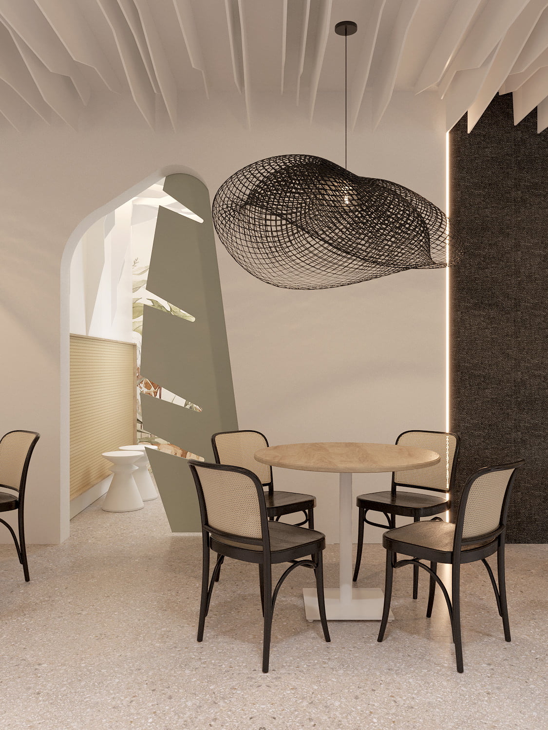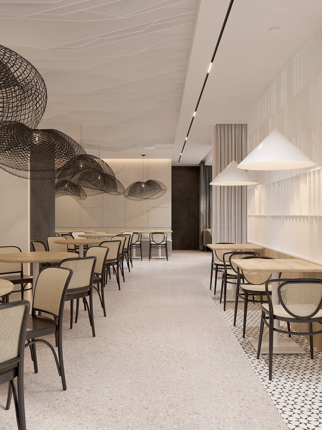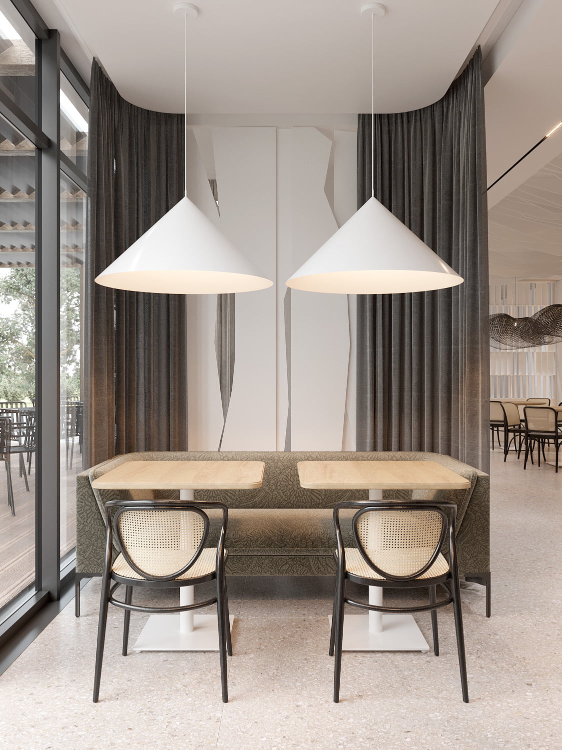 Projekt restauracji w Zawierciu. Dla inwestorów ważne było wyznaczenie kameralnych stref, ale także możliwość stworzenia przestrzeni dla większej ilości osób poprzez połączenie stolików. W stylistyce postawiłyśmy na wykorzystanie ponadczasowych materiałów oraz elementów stylu boho. Aranżacja utrzymana jest więc w beżach i szarościach, które jednak – by dodać nieco elegancji – uzupełniłyśmy o ciemne elementy.