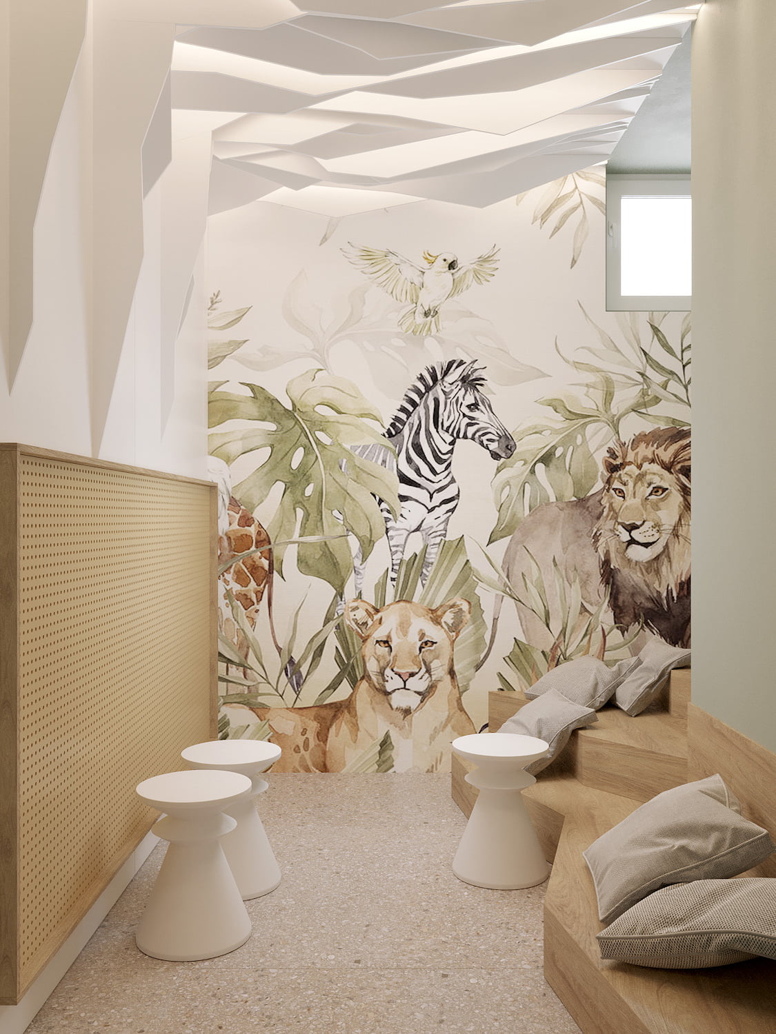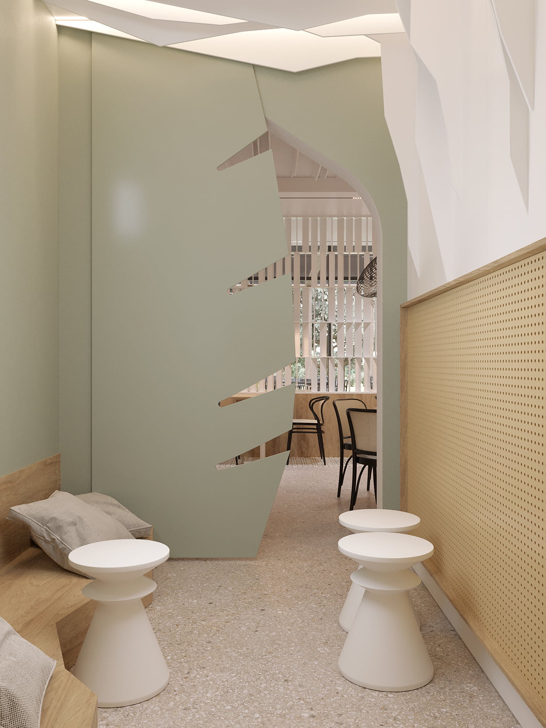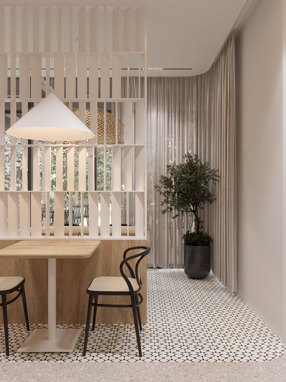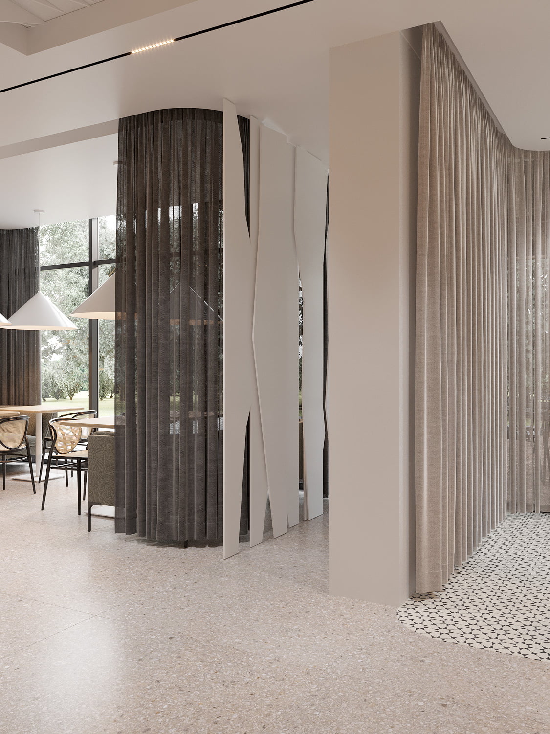 Projekt restauracji w Zawierciu. Dla inwestorów ważne było wyznaczenie kameralnych stref, ale także możliwość stworzenia przestrzeni dla większej ilości osób poprzez połączenie stolików. W stylistyce postawiłyśmy na wykorzystanie ponadczasowych materiałów oraz elementów stylu boho. Aranżacja utrzymana jest więc w beżach i szarościach, które jednak – by dodać nieco elegancji – uzupełniłyśmy o ciemne elementy.